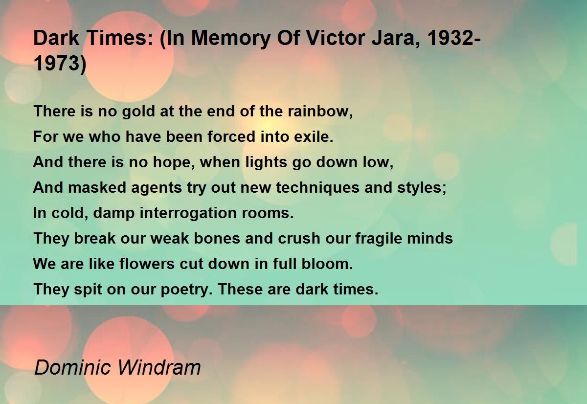A powerful poem Dominic that gets under the skin to make one stop and think about an individual's/countries/peoples rights and freedom. What eventually happened to Victor Java at the hands of the Pinochet regime was a cruel and tragic waste. 10++.And thanks for making me stop and think. To stop and think and count my blessings.