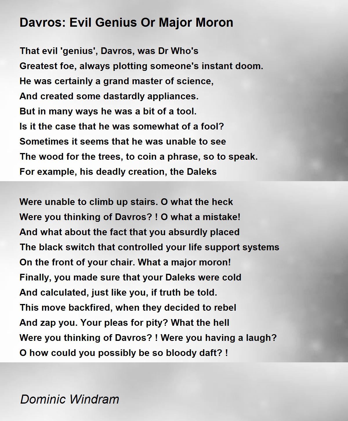 Brilliant! Loved it! Great memories are flooding back! And I totally forgot about his life support switch displayed on front of his chair. Davros the first time you see him as a kid was so evil, oozing hate and true menace with look and his creepy voice, but so, so captivating to watch. You just couldn't take your eyes off him. A truly engaging and most humorous poem I can really relate to Dominic. A full score and Tom Baker and Terry Nation would be proud of you.