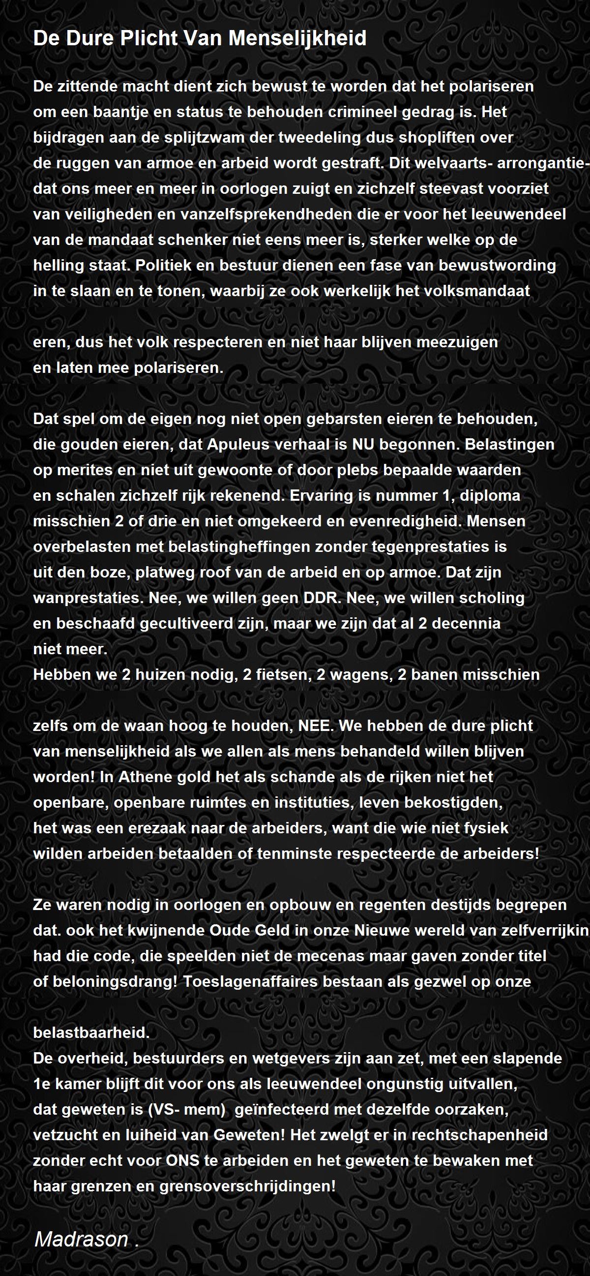 Hebben we 2 huizen nodig,2 fietsen,2 wagens,2 banen misschien zelfs om de waan hoog te houden, NEE. We hebben de dure plicht van menselijkheid als we allen als mens behandeld willen blijven worden! In Athene gold het als schande als de rijken niet het openbare, openbare ruimtes en instituties, leven bekostigden, het was een erezaak naar de arbeiders, want die wie niet fysiek wilden arbeiden betaalden of tenminste respecteerde de arbeiders!