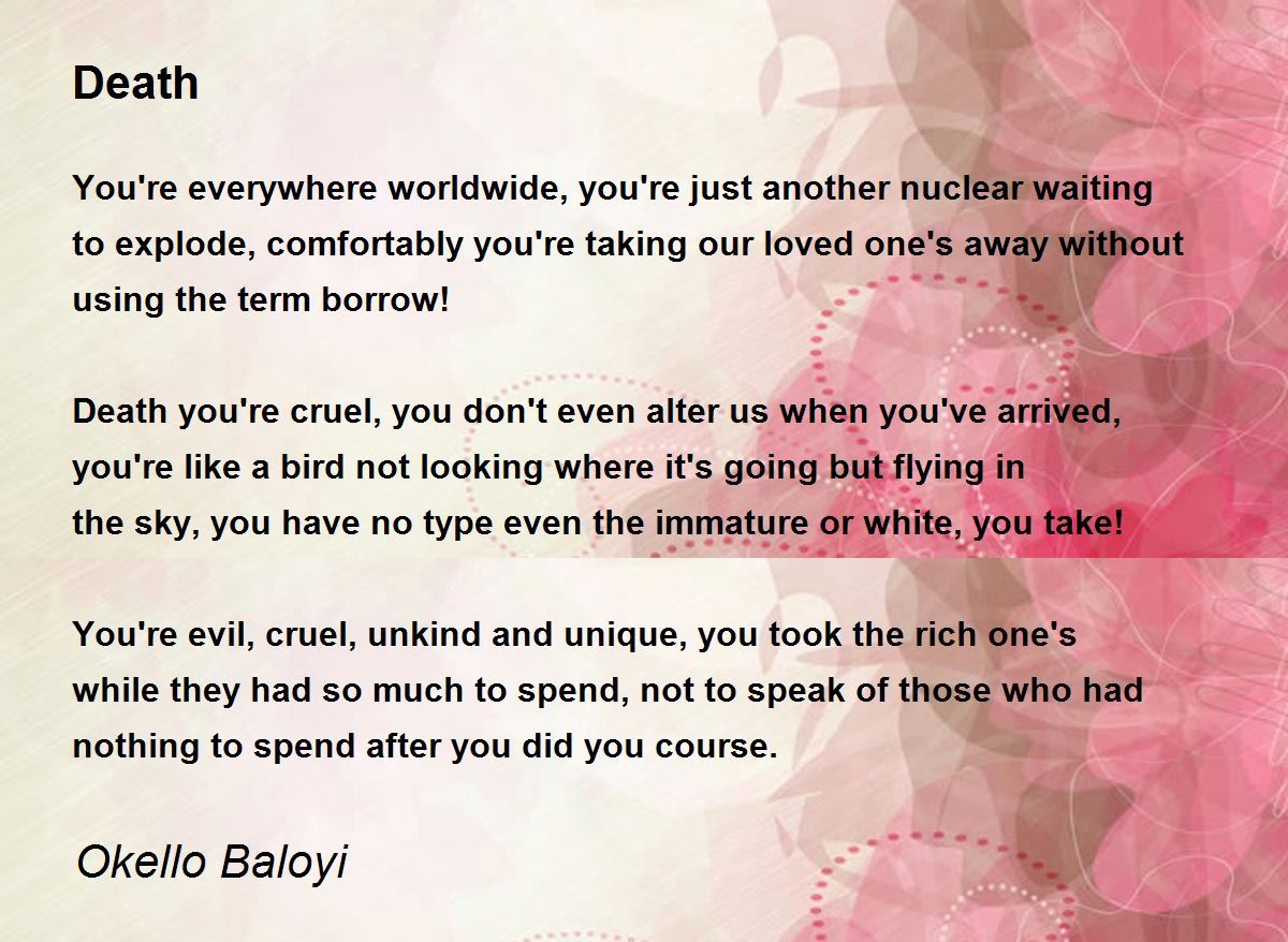 Death you're cruel, you don't even alter us when you've arrived, you're like a bird not looking where it's going but flying in the sky, you have no type even the immature or white, you take!