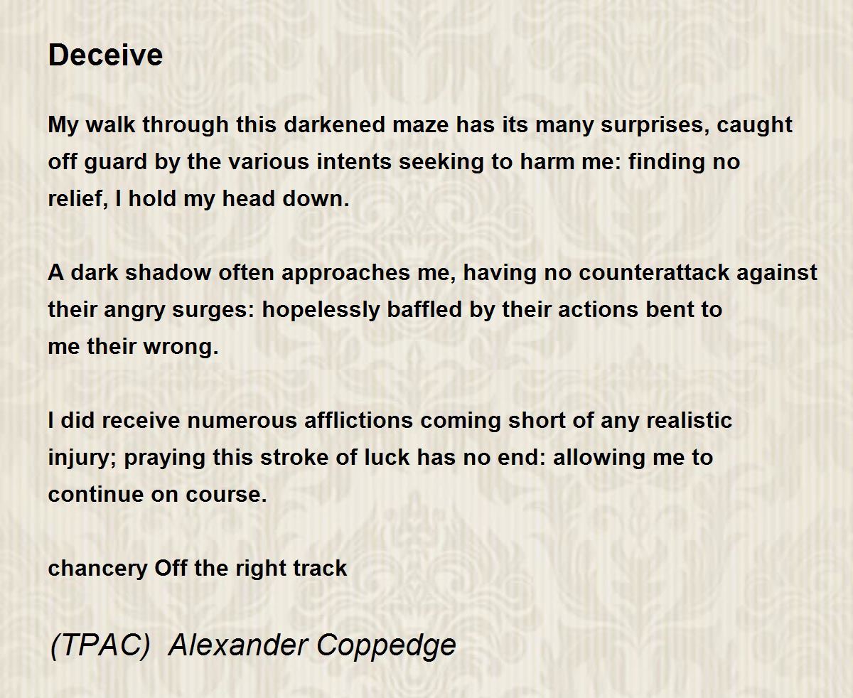 A dark shadow often approaches me, having no counterattack against their angry surges: hopelessly baffled by their actions bent to me their wrong.