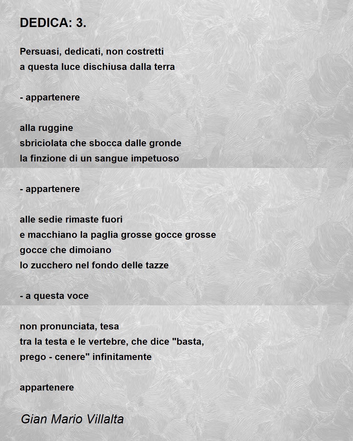 [Villalta’s poetry.. As the author himself affirms: ] ''... What I would like to do, .., is to let things enter me so deeply that I can simply say how they are. Technically it works through simplifications, passages and exclusions like in all art forms, with rules to respect that are born of a basic idea: let reality pass, let it enter into the movements of the body, into the way of seeing things, and try to give it a form.... ''