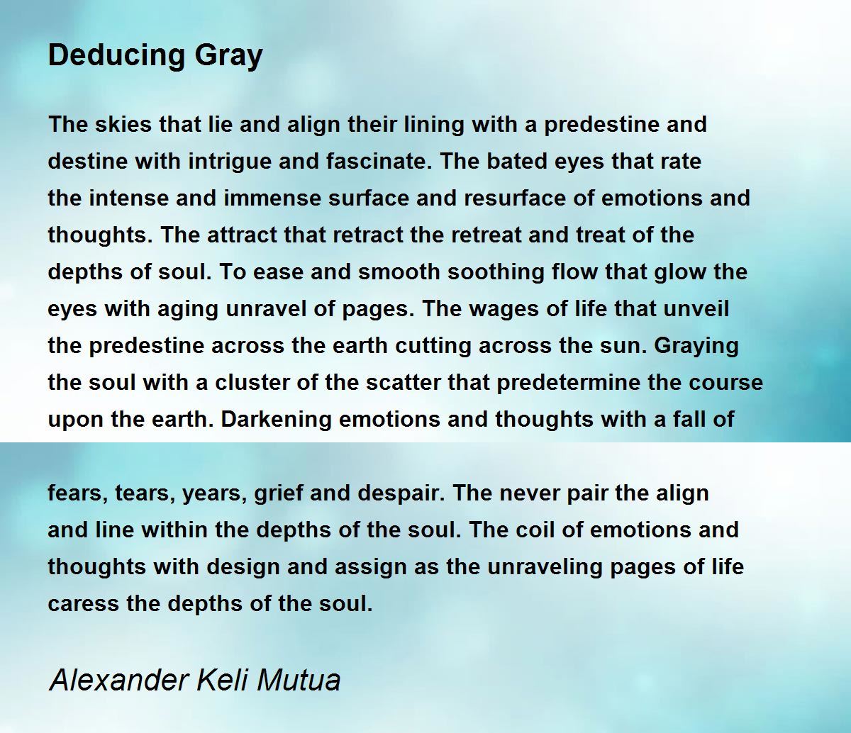 The skies that lie and align their lining with a predestine and destine with intrigue and fascinate. The bated eyes that rate the intense and immense surface and resurface of emotions and thoughts. The attract that retract the retreat and treat of the depths of soul. To ease and smooth soothing flow that glow the eyes with aging unravel of pages. The wages of life that unveil the predestine across the earth cutting across the sun. Graying the soul with a cluster of the scatter that predetermine the course upon the earth. Darkening emotions and thoughts with a fall of fears, tears, years, grief and despair. The never pair the align and line within the depths of the soul. The coil of emotions and thoughts with design and assign as the unraveling pages of life caress the depths of the soul.
