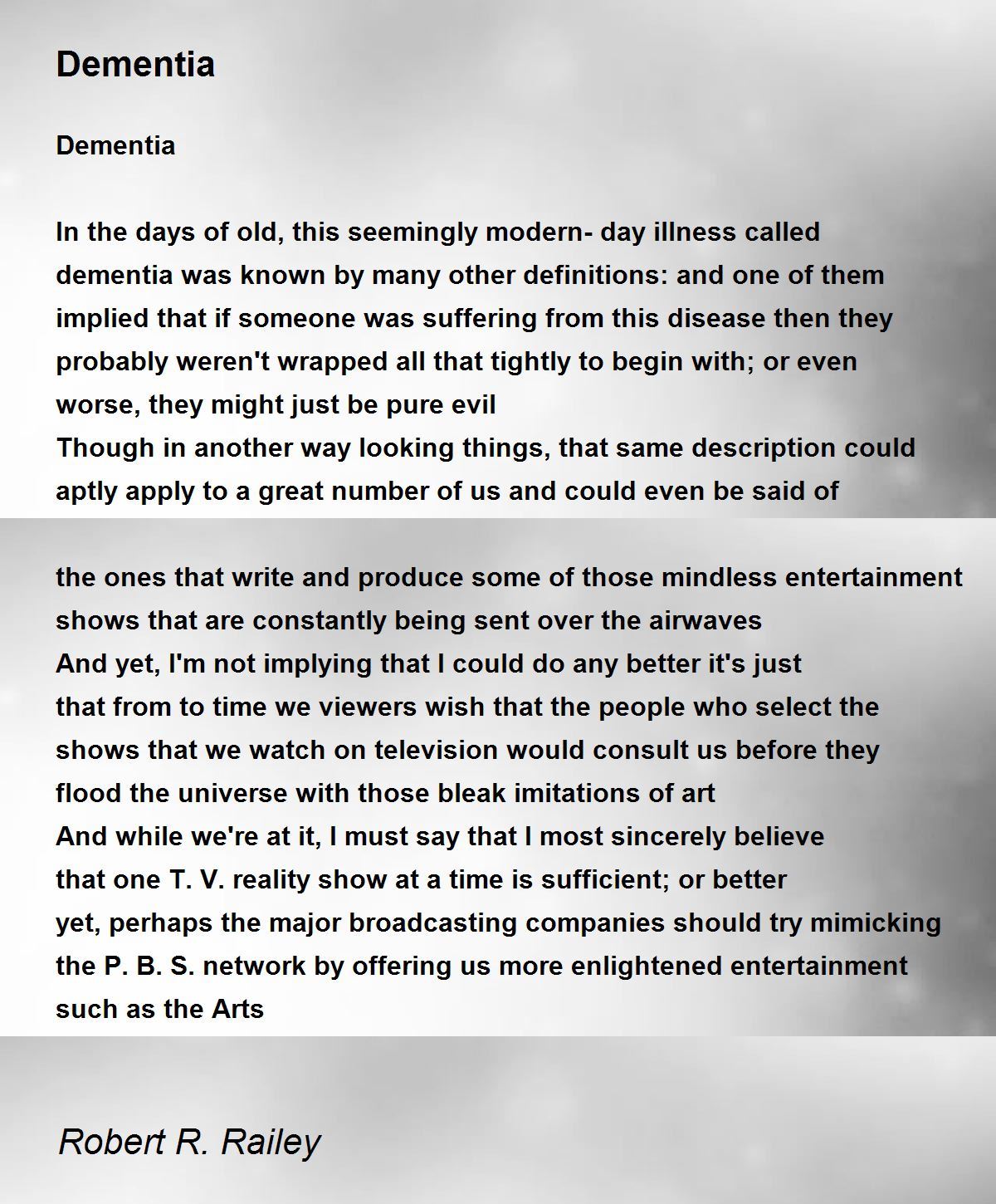 And while we're at it, I must say that I most sincerely believe that one T. V. reality show at a time is sufficient; or better yet, perhaps the major broadcasting companies should try mimicking the P. B. S. network by offering us more enlightened entertainment such as the Arts