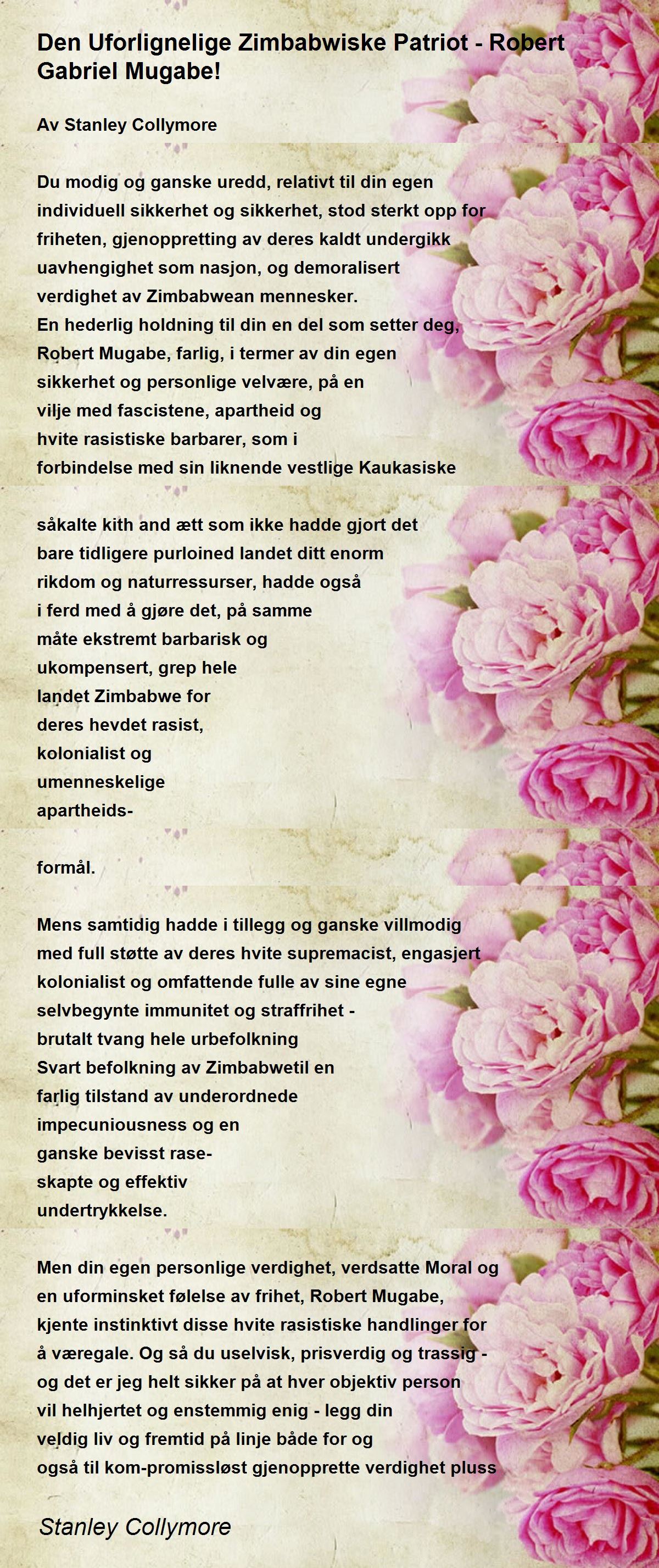 For meg, personlig, var Robert Mugabe utvilsomt, fremdeles er det, og vil for alltid forbli uforanderlig en helt i enhver tenkelig positiv etymologisk betydning av dette ordet. Videre har intensiv og analytisk forskning av meg både omfattende og kategorisk vist at mine dypt innebygde følelser angående denne uforlignelige store mannen på samme måte deles av millioner av mennesker, ikke bare i Robert Mugabes urbefolkning hjemland Zimbabwe, kontinentet generelt og det bredere afrikanske Diaspora på begge sider av Atlanterhavet, men også blant andre ikke-rasistiske, rettferdige og ikke-svarte bestander globalt.