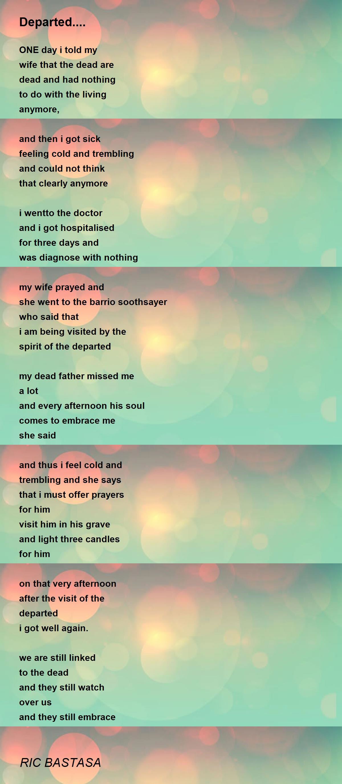 This is so sad that your dead father missed you a lot. Soul never dies although body dies. Life exists even after death and soul carries on paranormal activities. Visiting departed spirit you can share emotion and deep feelings. This poem is emotive and excellently penned...10
