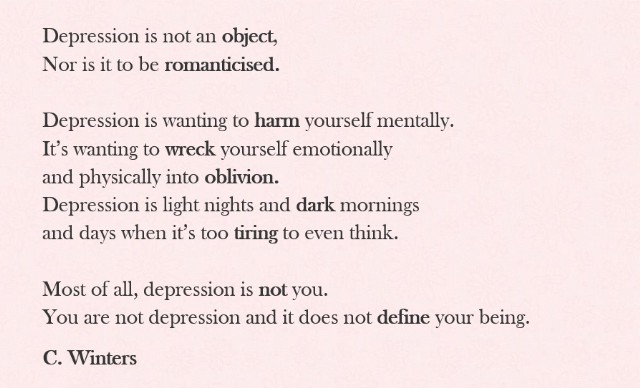 Depression is souvenir of mind in hard work, Depression is the harvest of mind's concerning about meaning of objects although it may impose feeling of woe and sadness against mind of true-seeking but intrinsically depression is source of insight. Thanks dear Winters for sharing your poem.