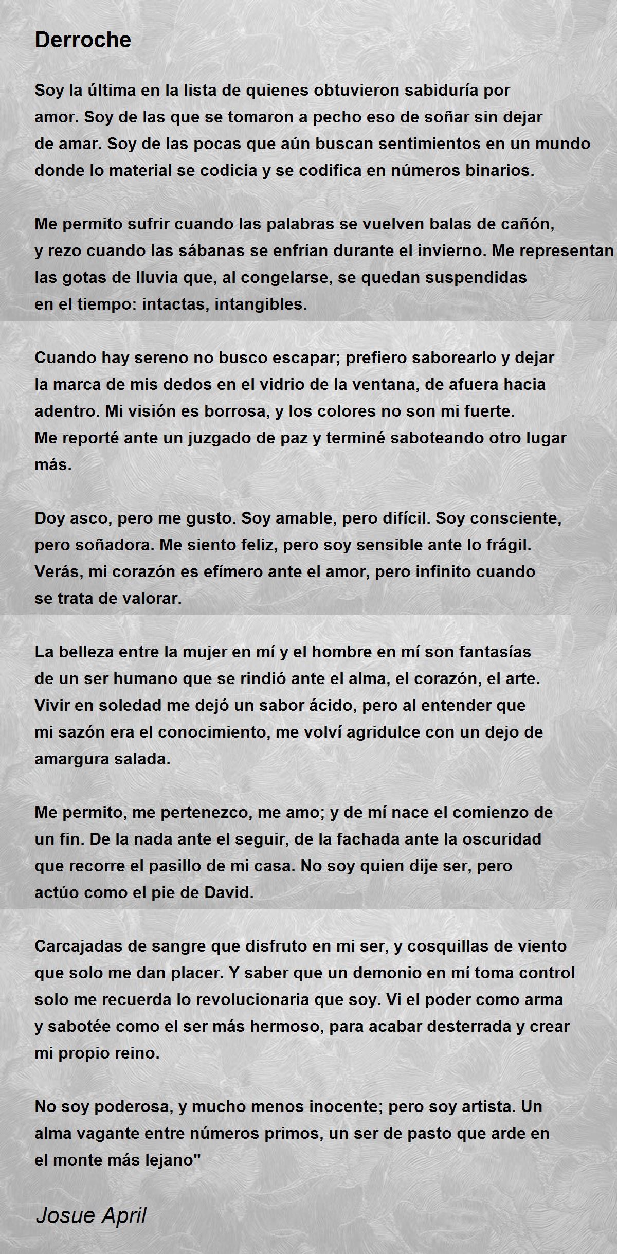 Soy la última en la lista de quienes obtuvieron sabiduría por amor. Soy de las que se tomaron a pecho eso de soñar sin dejar de amar. Soy de las pocas que aún buscan sentimientos en un mundo donde lo material se codicia y se codifica en números binarios.