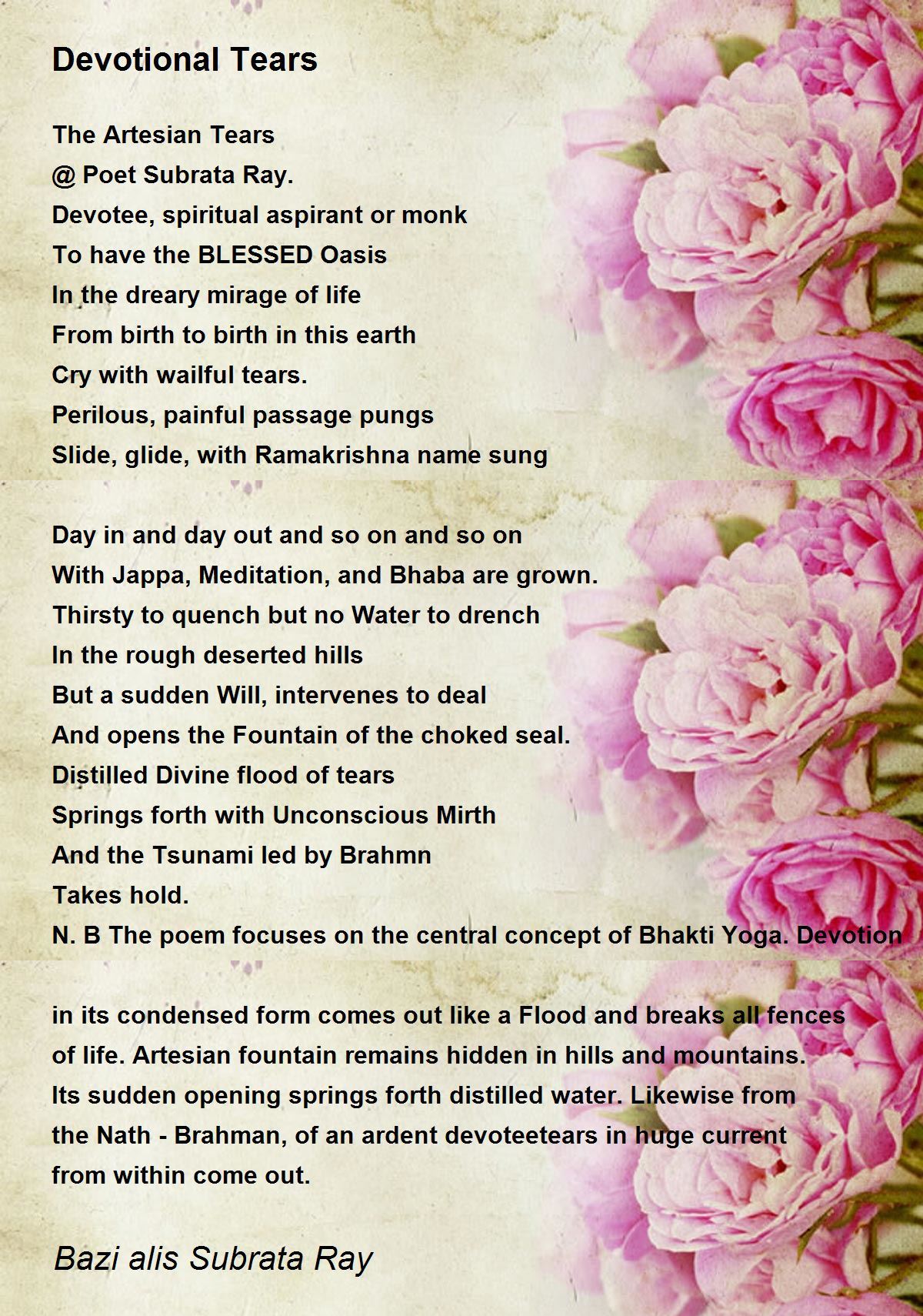 N.B The poem focuses on the central concept of Bhakti Yoga. Devotion in its condensed form comes out like a Flood and breaks all fences of life. Artesian fountain remains hidden in hills and mountains. Its sudden opening springs forth distilled water. Likewise from the Nath -Brahman, of an ardent devoteetears in huge current from within come out.