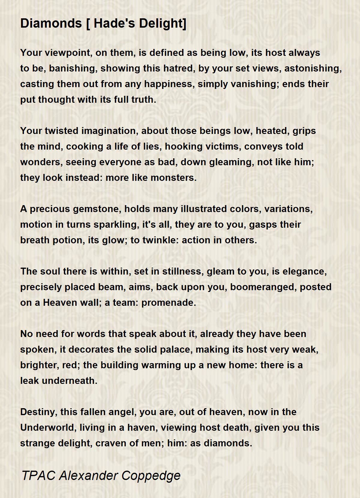 Destiny, this fallen angel, you are, out of heaven, now in the Underworld, living in a haven, viewing host death, given you this strange delight, craven of men; him: as diamonds.