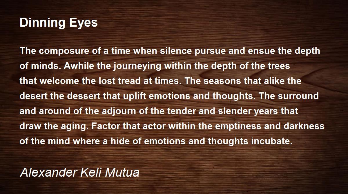The composure of a time when silence pursue and ensue the depth of minds. Awhile the journeying within the depth of the trees that welcome the lost tread at times. The seasons that alike the desert the dessert that uplift emotions and thoughts. The surround and around of the adjourn of the tender and slender years that draw the aging. Factor that actor within the emptiness and darkness of the mind where a hide of emotions and thoughts incubate.