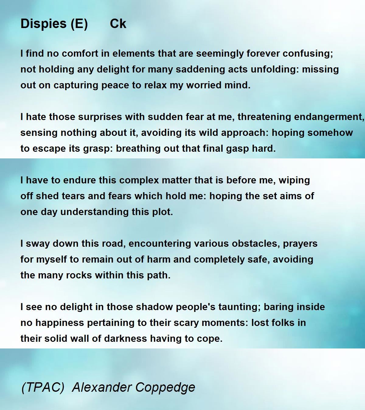I hate those surprises with sudden fear at me, threatening endangerment, sensing nothing about it, avoiding its wild approach: hoping somehow to escape its grasp: breathing out that final gasp hard.