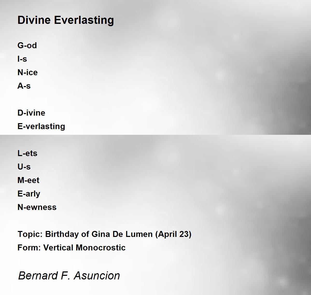 G-od I-s N-ice A-s D-ivine E-v erlasting......loved these lines. Beautiful poem. TFS.