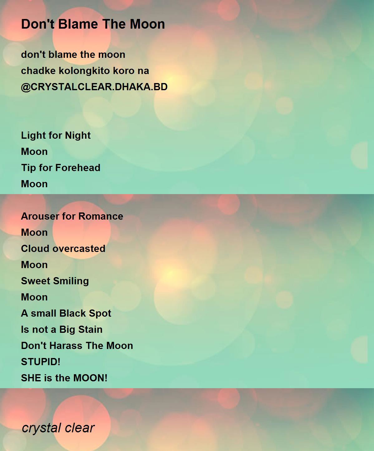 Night, Forehead, moon, Romance, cloud, smile, stain - - - thank you for this poem. These are the points i collected from your poem Stupid.. she is the moon.. lovely poem. tony.