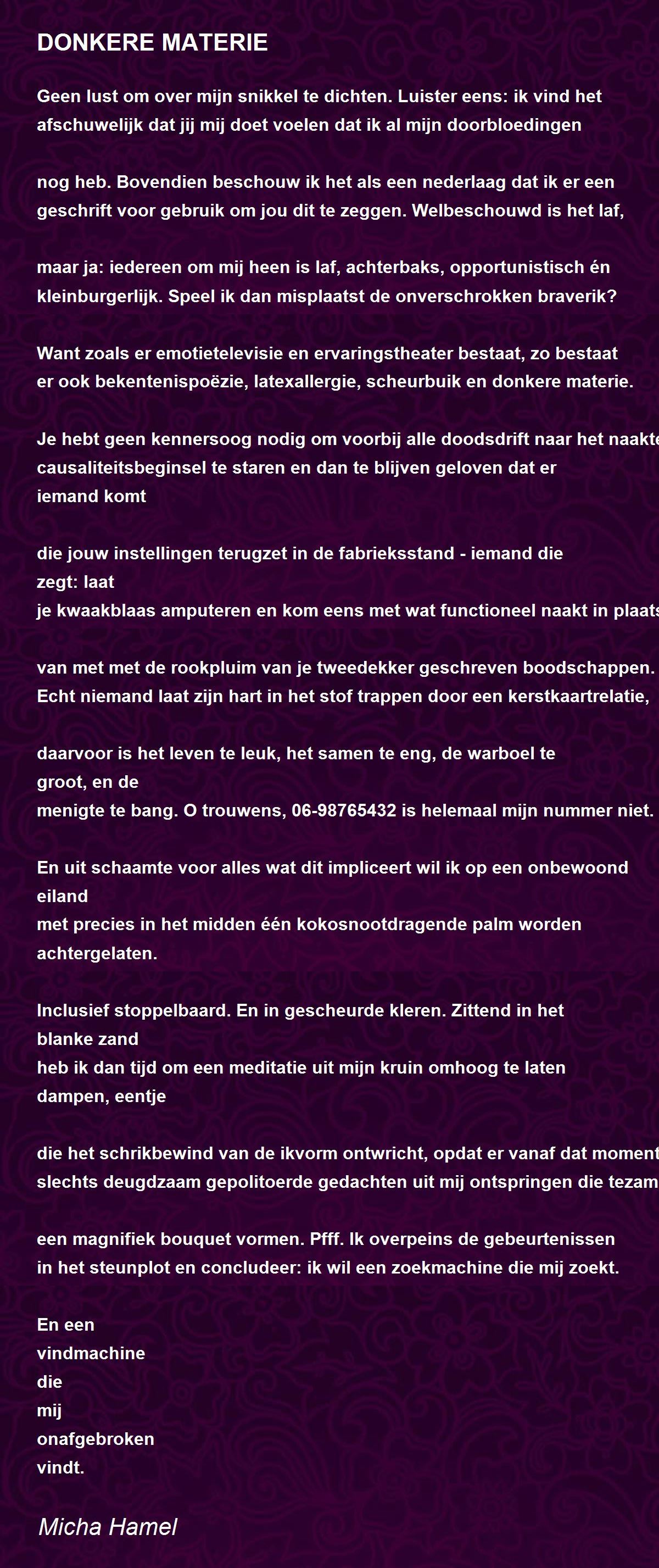 er ook bekentenispoëzie, latexallergie, scheurbuik en donkere materie.
