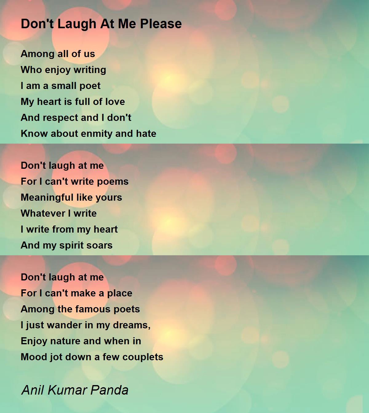 I wrote the poem 'Poets With Sincere Heartfelt Feelings', inspired by the poem 'Don't Laugh At Me Please', by the poet Anil Kumar Panda and dedicated to the poet Anil Kumar Panda.