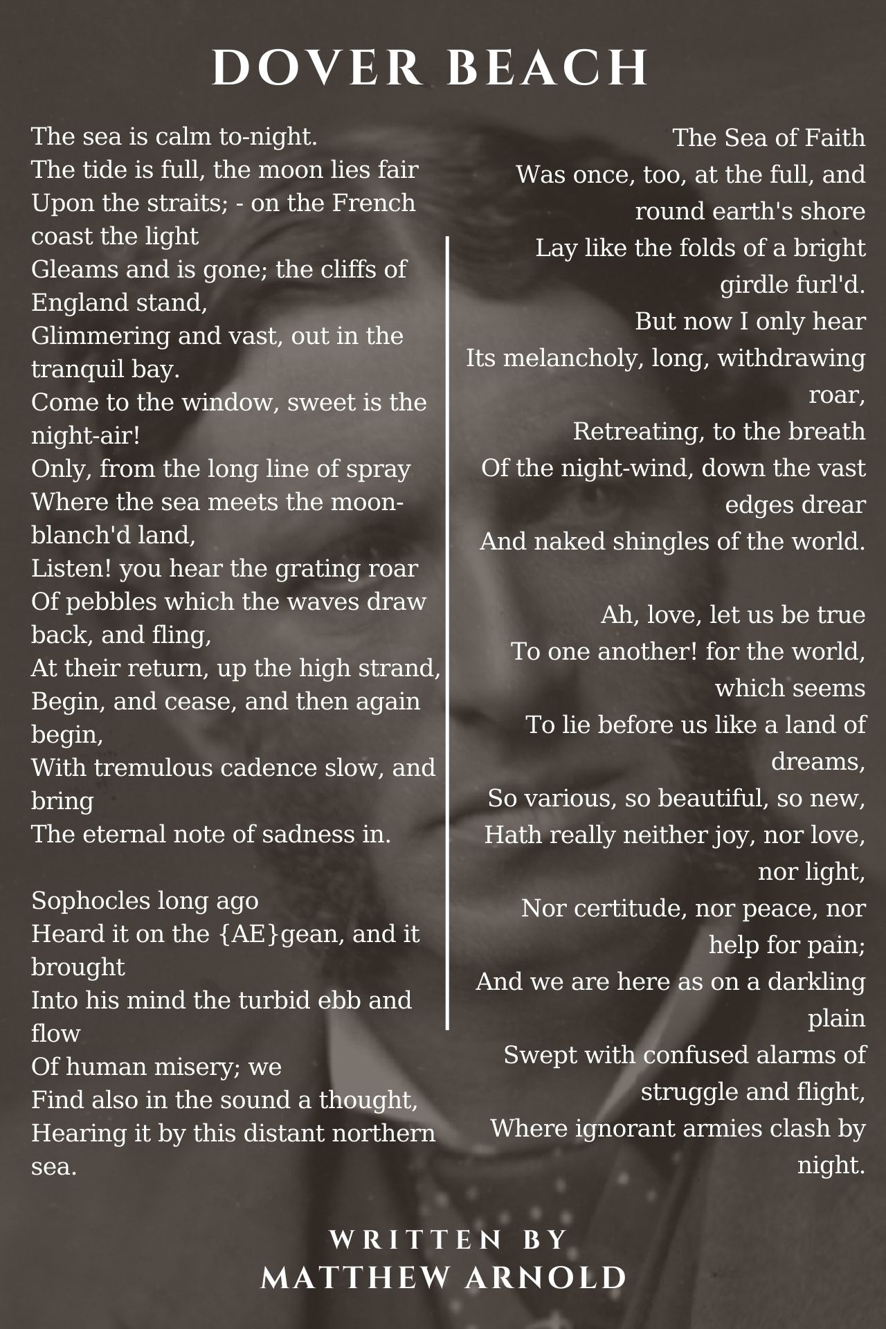Dover Beach is a celebrated poem that addresses a crisis of faith. A major theme in 'Dover Beach' concerns the declining influence of Christianity. So very true and crystal clear.