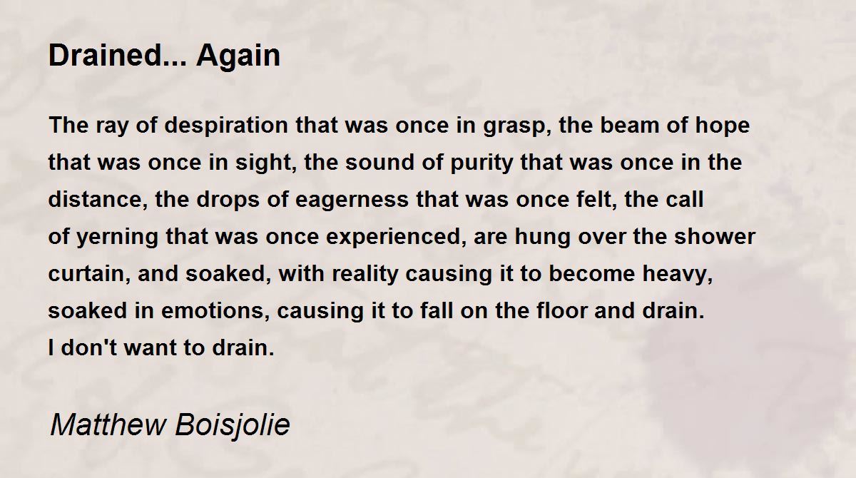 The ray of despiration that was once in grasp, the beam of hope that was once in sight, the sound of purity that was once in the distance, the drops of eagerness that was once felt, the call of yerning that was once experienced, are hung over the shower curtain, and soaked, with reality causing it to become heavy, soaked in emotions, causing it to fall on the floor and drain. I don't want to drain.