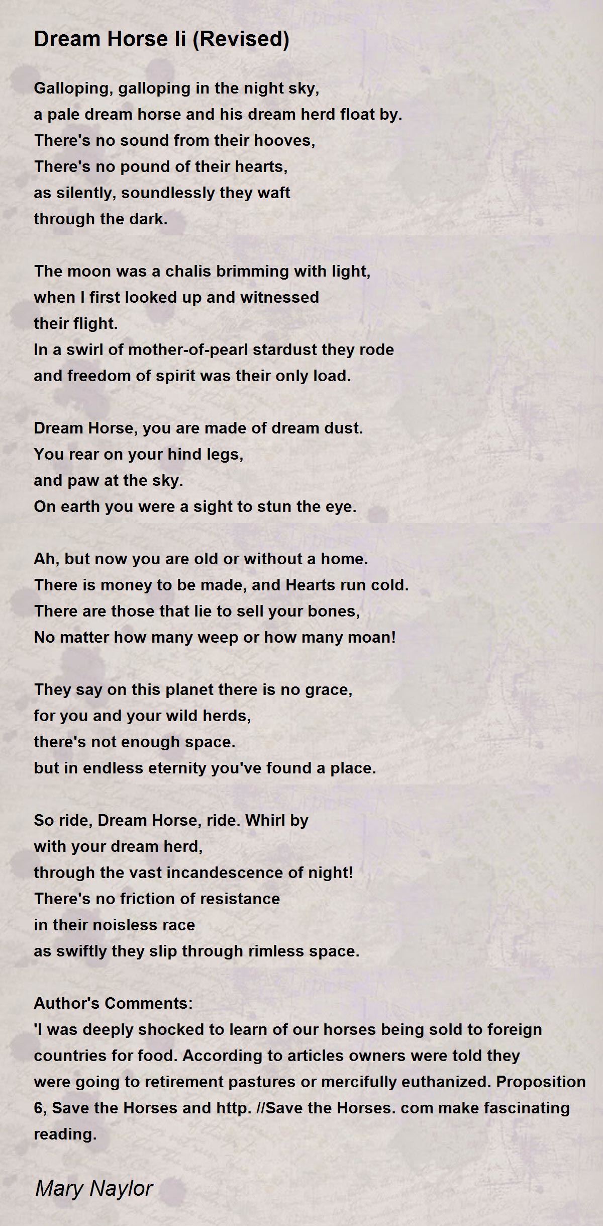 Wonderful imagery in this beautiful dreamscape of galloping horses. And so much compassion too. I love this one, Mary. Take care. Warmest regards, Sandra