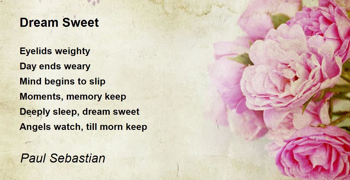 Eyelids weighty Day ends weary Mind begins to slip Moments, memory keep Deeply sleep, dream sweet Angels watch, till morn keep