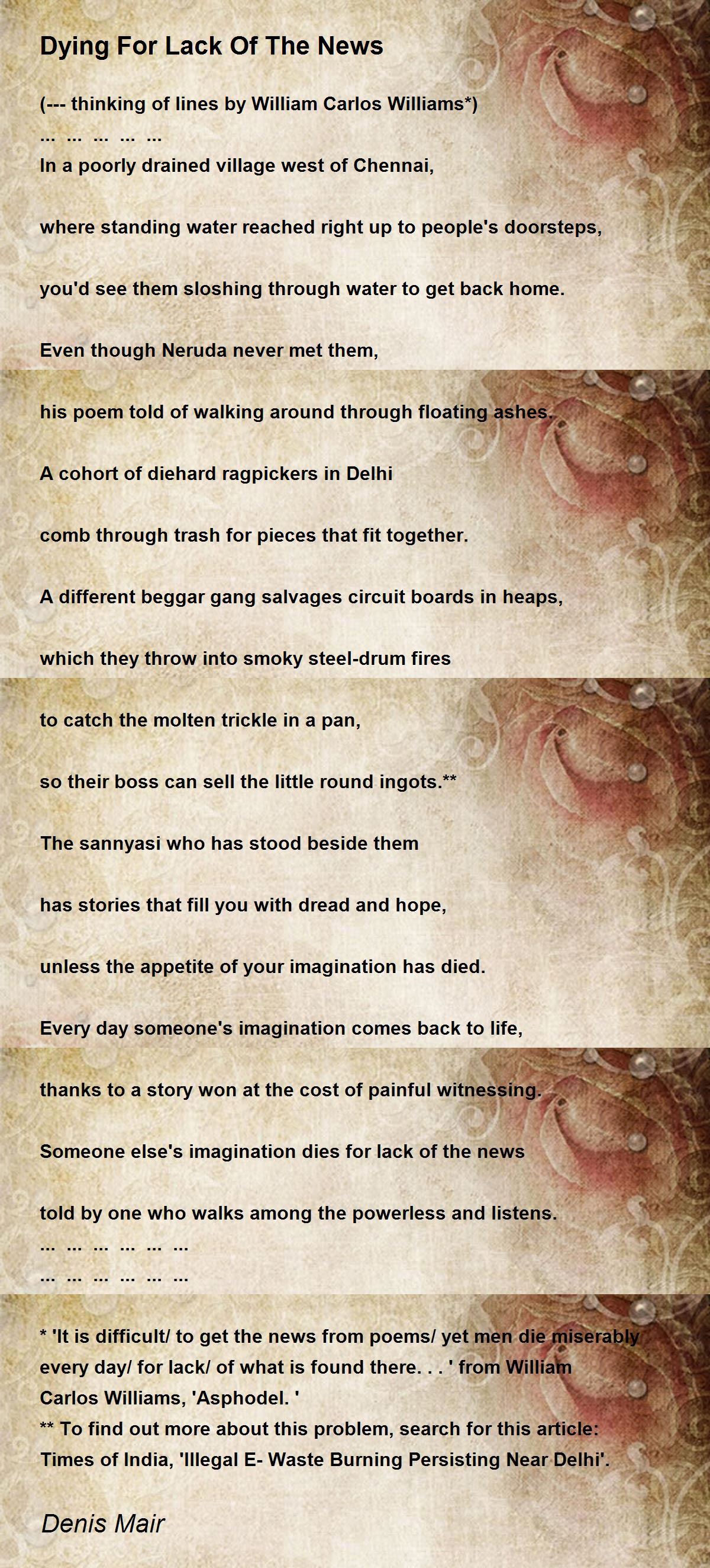 * 'It is difficult/ to get the news from poems/ yet men die miserably every day/ for lack/ of what is found there...' from William Carlos Williams, 'Asphodel.'