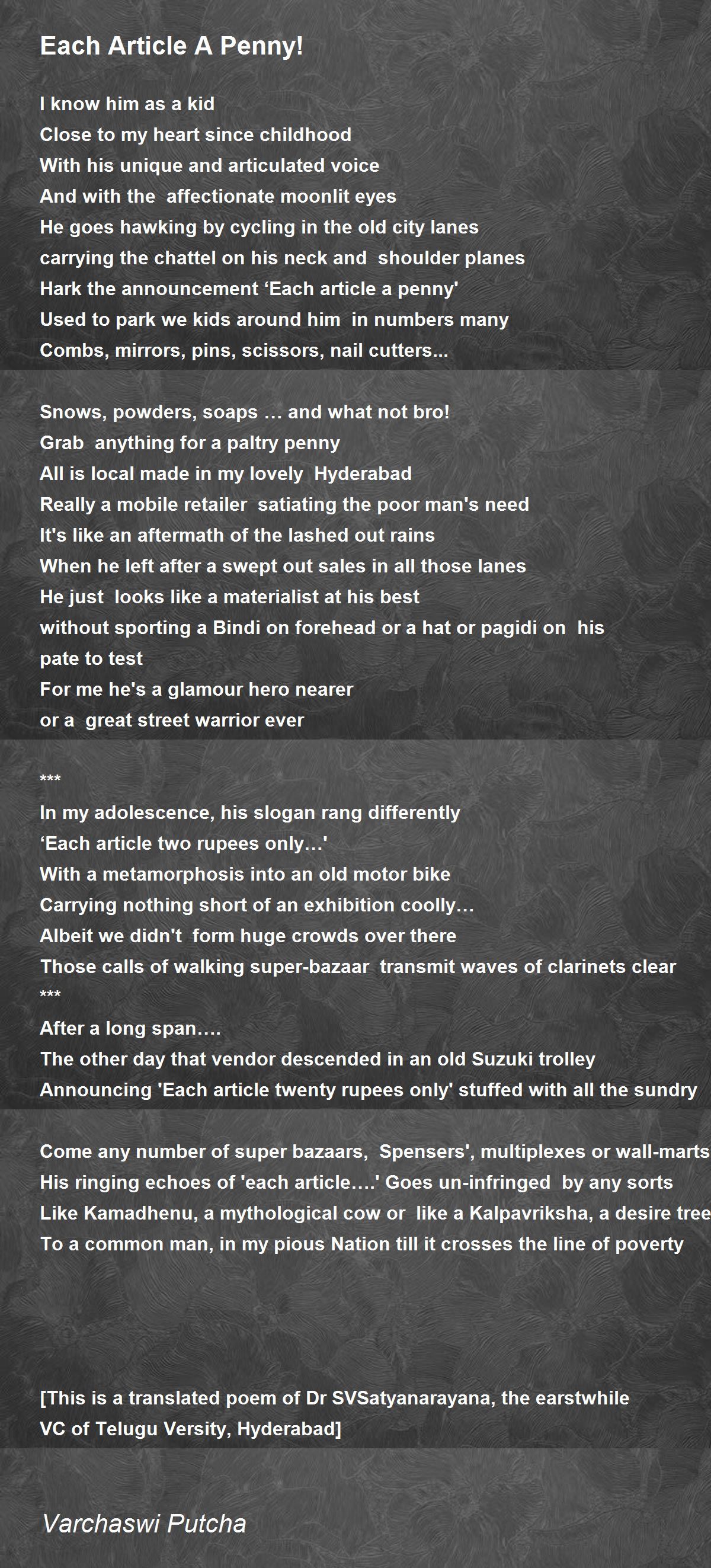 Announcing 'Each article twenty rupees only' stuffed with all the sundry