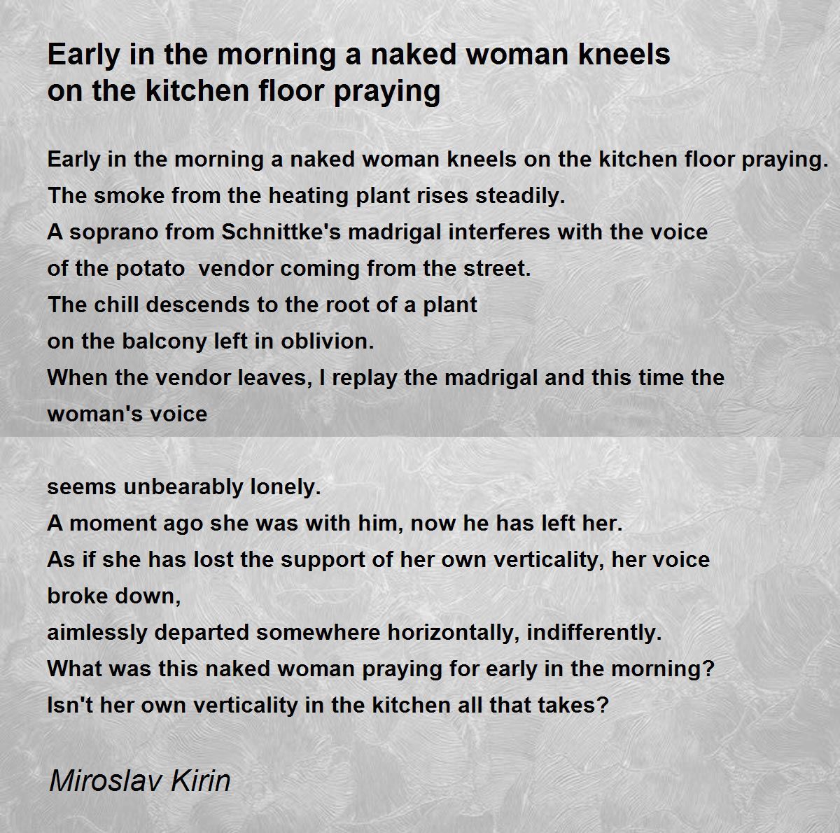 Early in the morning a naked woman kneels on the kitchen floor praying.