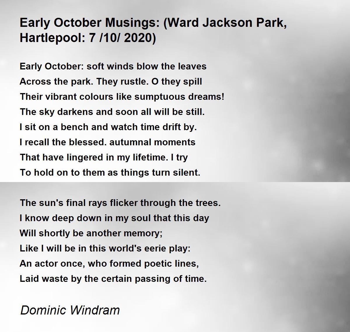 Dominic life and death indeed and all it's musings, it comes to us all eventually, but in the meantime just keep writing great poetry and simply enjoy life. And there is something truly memorable and haunting about autumn leaves gathered on empty well worn wooden benches. Five stars and thank you. Take care.