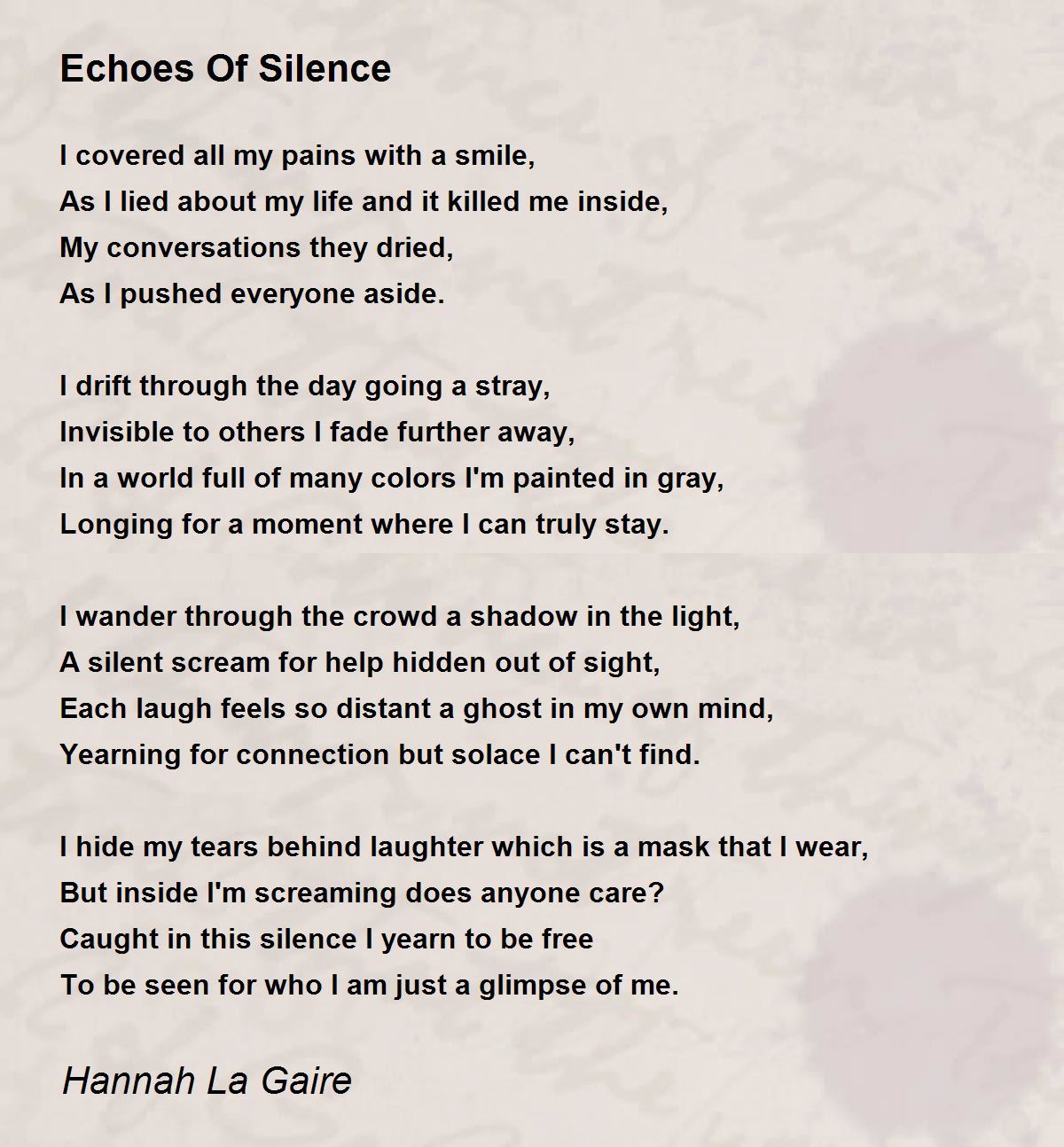 Invisible to others I fade further away,