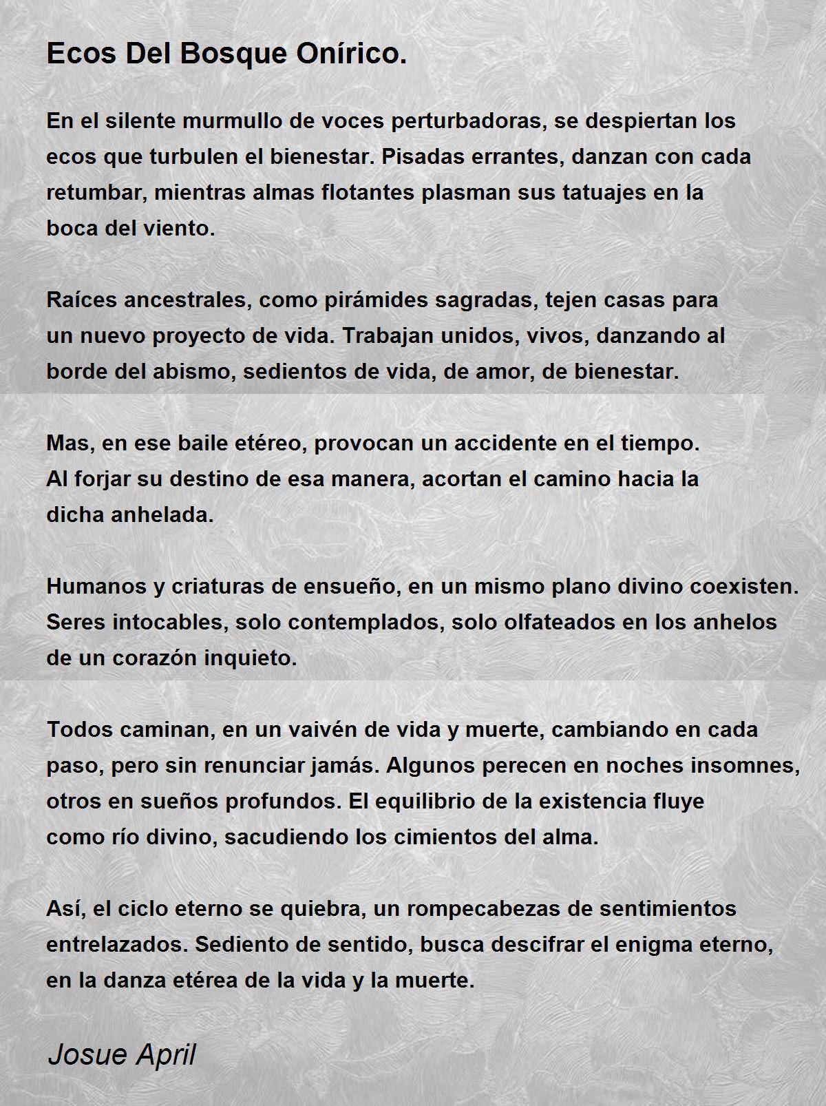 Así, el ciclo eterno se quiebra, un rompecabezas de sentimientos entrelazados. Sediento de sentido, busca descifrar el enigma eterno, en la danza etérea de la vida y la muerte.
