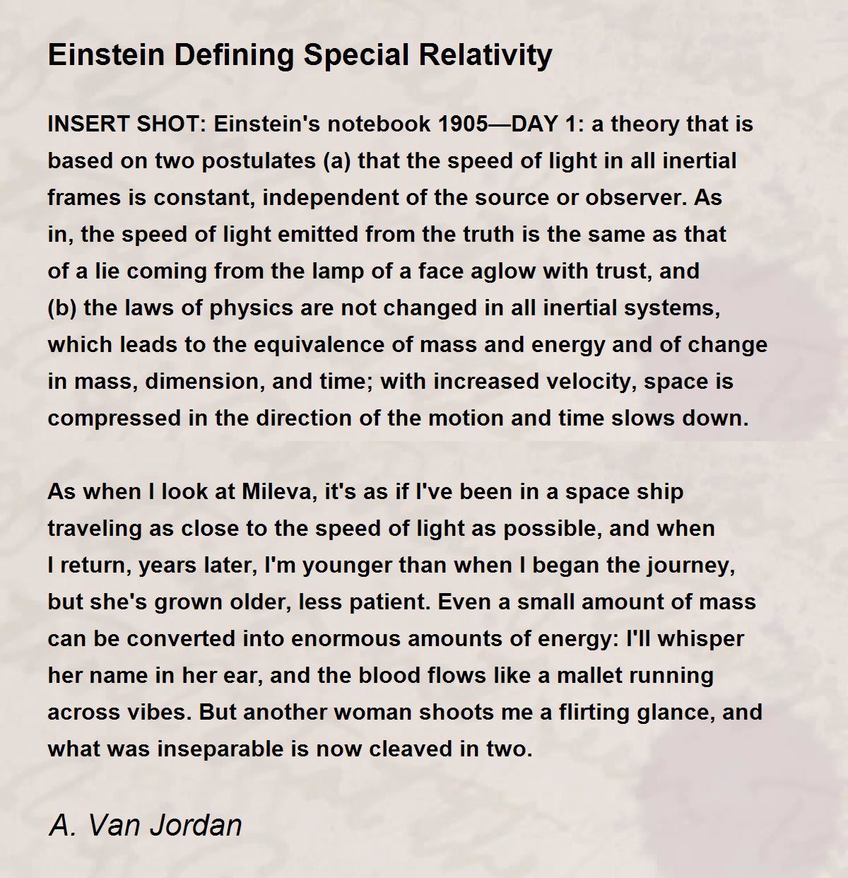 INSERT SHOT: Einstein's notebook 1905—DAY 1: a theory that is based on two postulates (a) that the speed of light in all inertial frames is constant, independent of the source or observer. As in, the speed of light emitted from the truth is the same as that of a lie coming from the lamp of a face aglow with trust, and (b) the laws of physics are not changed in all inertial systems, which leads to the equivalence of mass and energy and of change in mass, dimension, and time; with increased velocity, space is compressed in the direction of the motion and time slows down. As when I look at Mileva, it's as if I've been in a space ship traveling as close to the speed of light as possible, and when I return, years later, I'm younger than when I began the journey, but she's grown older, less patient. Even a small amount of mass can be converted into enormous amounts of energy: I'll whisper her name in her ear, and the blood flows like a mallet running across vibes. But another woman shoots me a flirting glance, and what was inseparable is now cleaved in two.