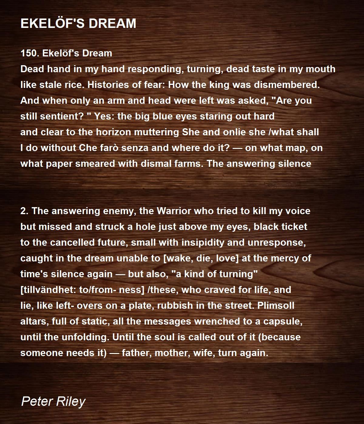 2. The answering enemy, the Warrior who tried to kill my voice but missed and struck a hole just above my eyes, black ticket to the cancelled future, small with insipidity and unresponse, caught in the dream unable to [wake, die, love] at the mercy of time's silence again — but also, "a kind of turning" [tillvändhet: to/from-ness] /these, who craved for life, and lie, like left-overs on a plate, rubbish in the street. Plimsoll altars, full of static, all the messages wrenched to a capsule, until the unfolding. Until the soul is called out of it (because someone needs it) — father, mother, wife, turn again.