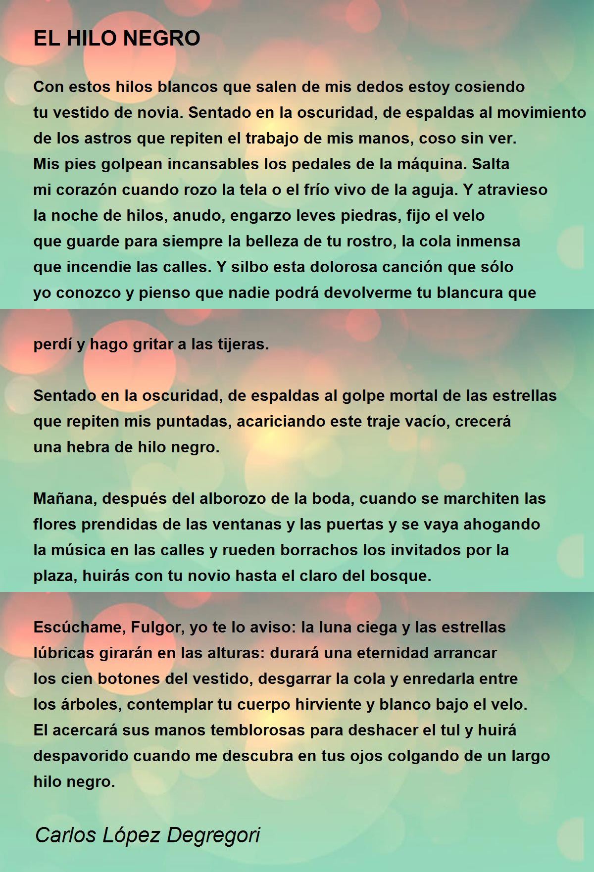 Con estos hilos blancos que salen de mis dedos estoy cosiendo tu vestido de novia. Sentado en la oscuridad, de espaldas al movimiento de los astros que repiten el trabajo de mis manos, coso sin ver. Mis pies golpean incansables los pedales de la máquina. Salta mi corazón cuando rozo la tela o el frío vivo de la aguja. Y atravieso la noche de hilos, anudo, engarzo leves piedras, fijo el velo que guarde para siempre la belleza de tu rostro, la cola inmensa que incendie las calles. Y silbo esta dolorosa canción que sólo yo conozco y pienso que nadie podrá devolverme tu blancura que perdí y hago gritar a las tijeras.