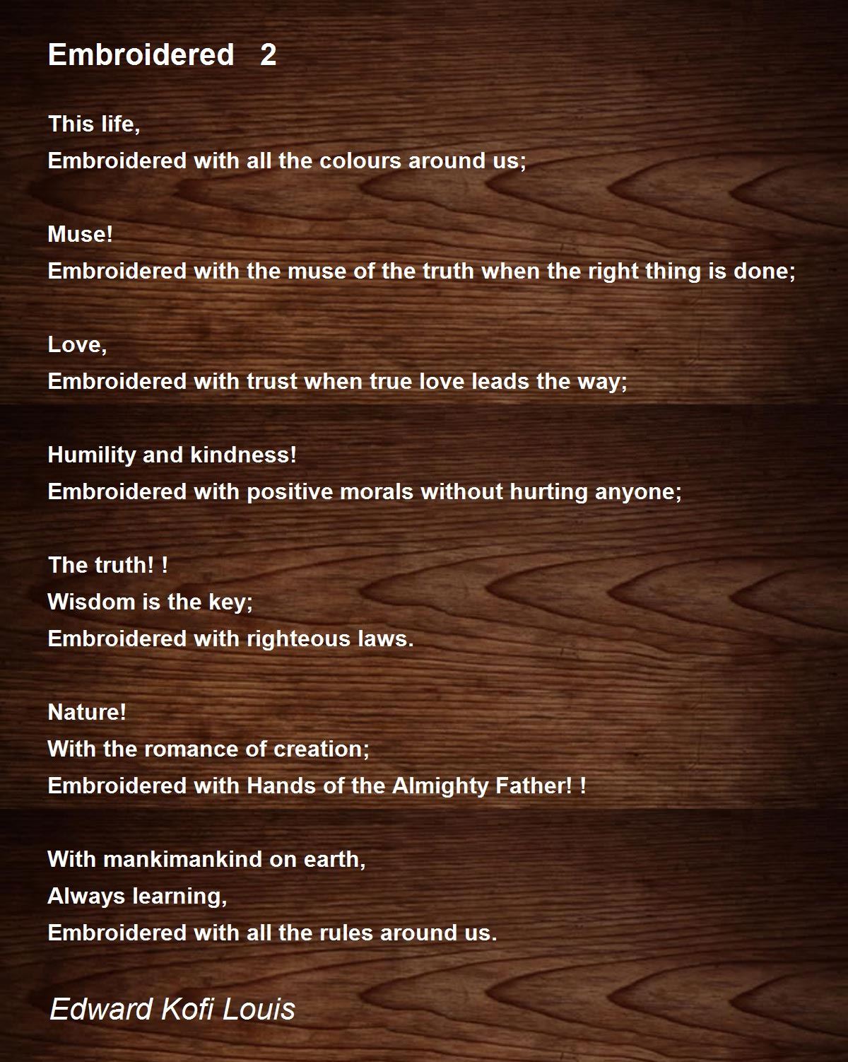 - - -Love, Embroidered with trust when true love leads the way- - - - - -Embroidered with Hands of the Almighty Father! ! - - - - Superb, I enjoyed the flow, form and the picture it painted.10+++++