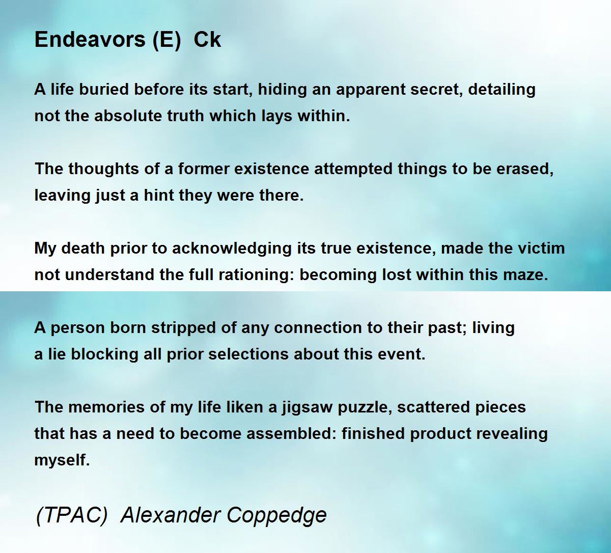The memories of my life liken a jigsaw puzzle, scattered pieces that has a need to become assembled: finished product revealing myself.