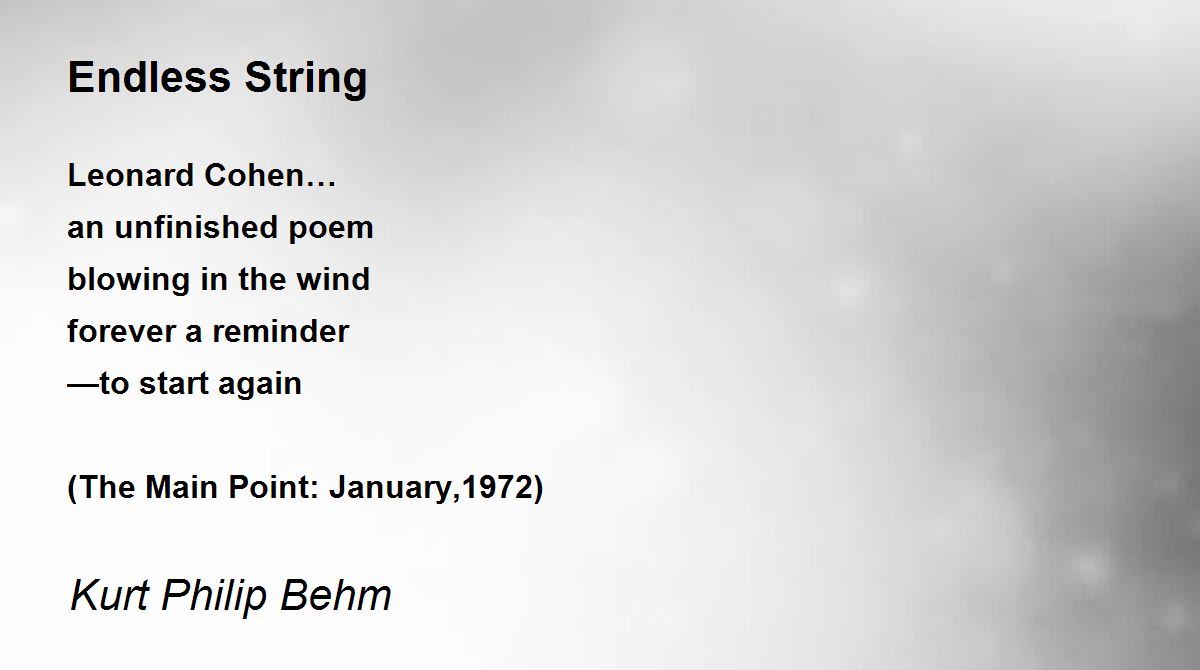 Leonard Cohen… an unfinished poem blowing in the wind forever a reminder —to start again (The Main Point: January,1972)