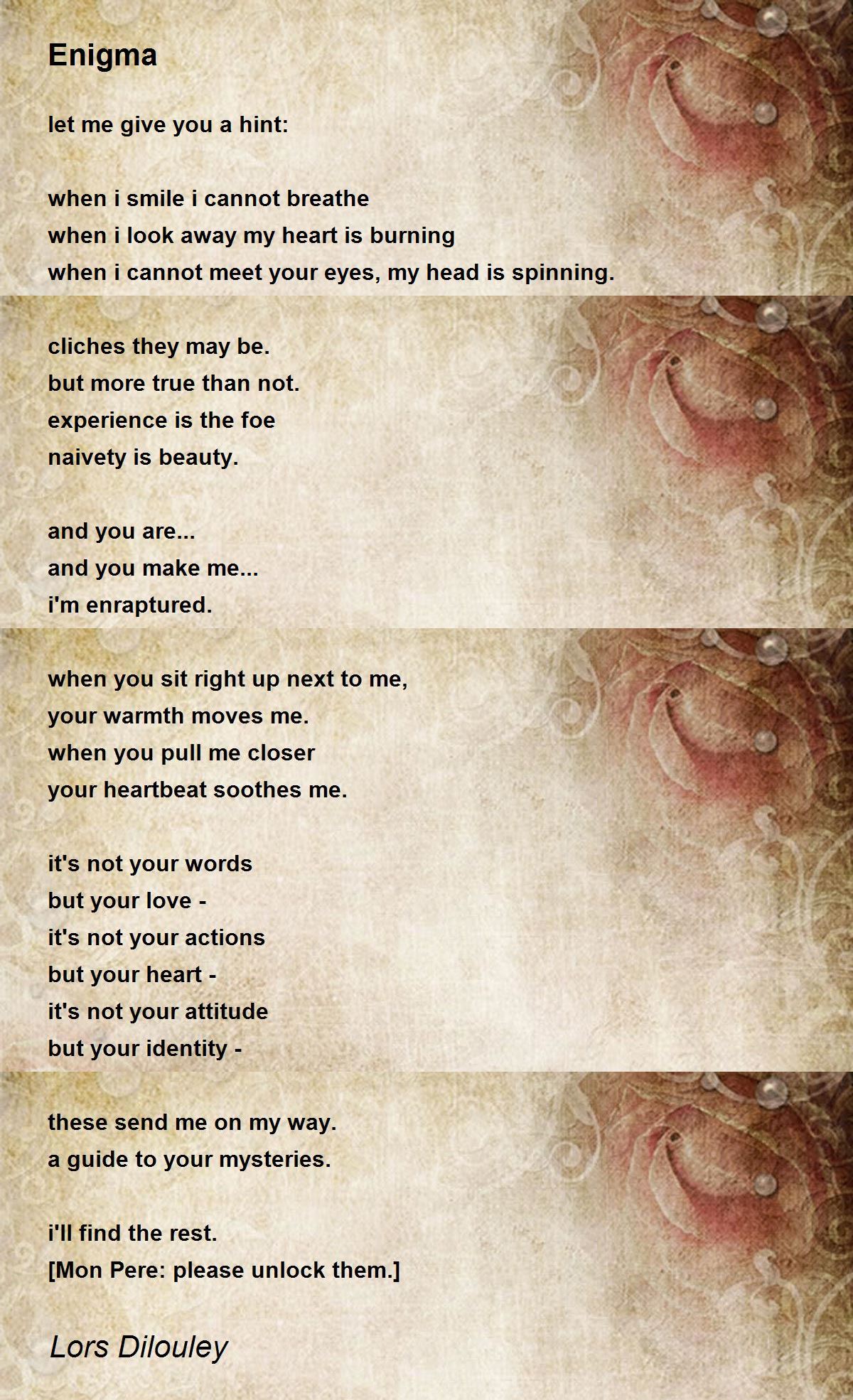 I like the title! Remain me of Sir Edward Elgar's Enigma music. Keep writing! Could you read and comment on my poems too? thank you.