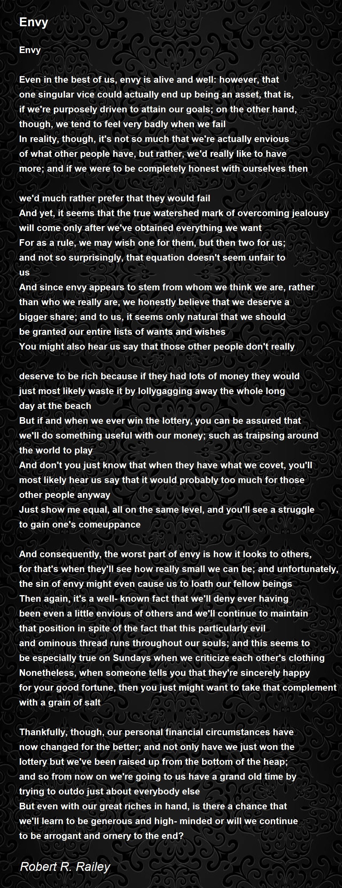 And consequently, the worst part of envy is how it looks to others, for that's when they'll see how really small we can be; and unfortunately, the sin of envy might even cause us to loath our fellow beings