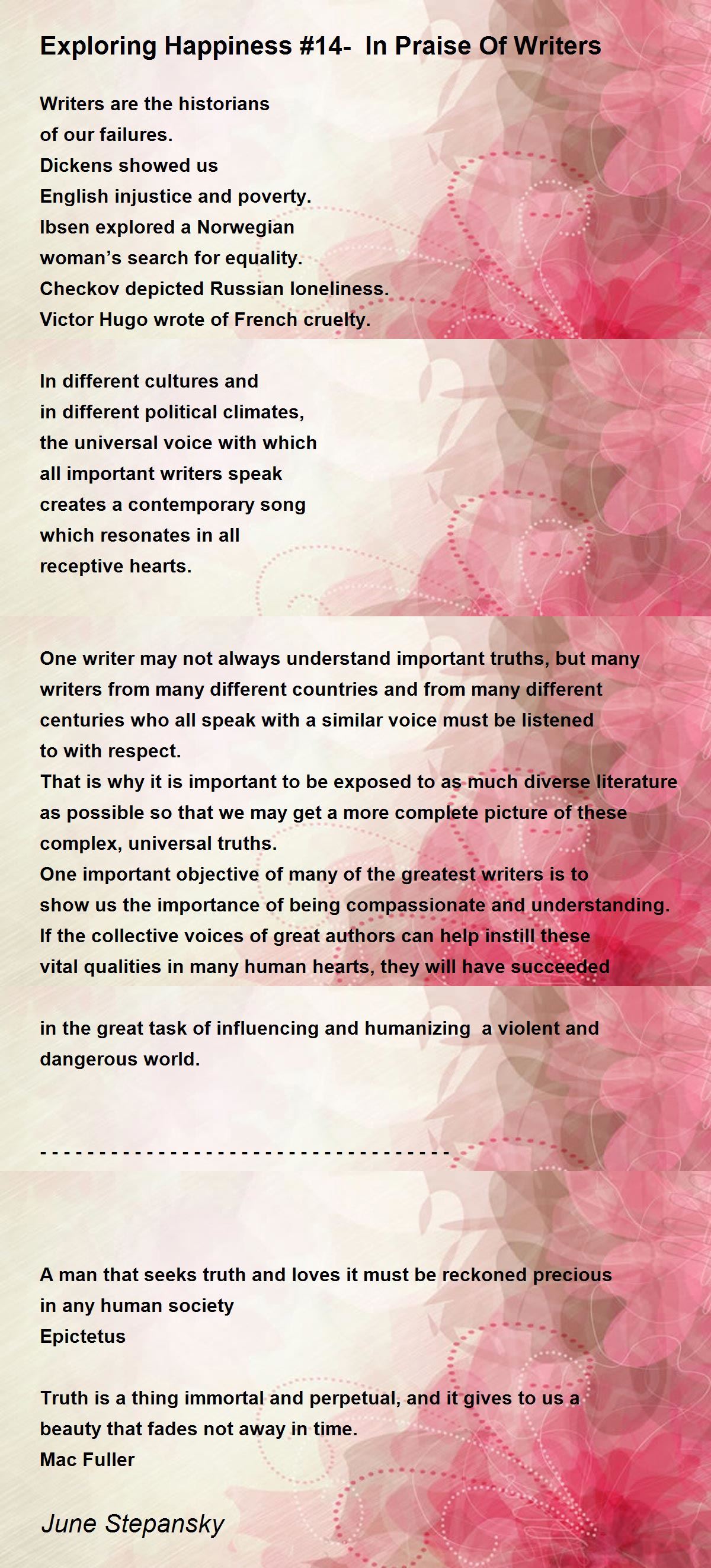 If the collective voices of great authors can help instill these vital qualities in many human hearts, they will have succeeded in the great task of influencing and humanizing a violent and dangerous world.