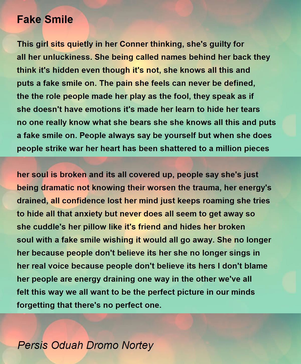 This girl sits quietly in her Conner thinking, she's guilty for all her unluckiness. She being called names behind her back they think it's hidden even though it's not, she knows all this and puts a fake smile on. The pain she feels can never be defined, the the role people made her play as the fool, they speak as if she doesn't have emotions it's made her learn to hide her tears no one really know what she bears she she knows all this and puts a fake smile on. People always say be yourself but when she does people strike war her heart has been shattered to a million pieces her soul is broken and its all covered up, people say she's just being dramatic not knowing their worsen the trauma, her energy's drained, all confidence lost her mind just keeps roaming she tries to hide all that anxiety but never does all seem to get away so she cuddle's her pillow like it's friend and hides her broken soul with a fake smile wishing it would all go away. She no longer her because people don't believe its her she no longer sings in her real voice because people don't believe its hers I don't blame her people are energy draining one way in the other we've all felt this way we all want to be the perfect picture in our minds forgetting that there's no perfect one.