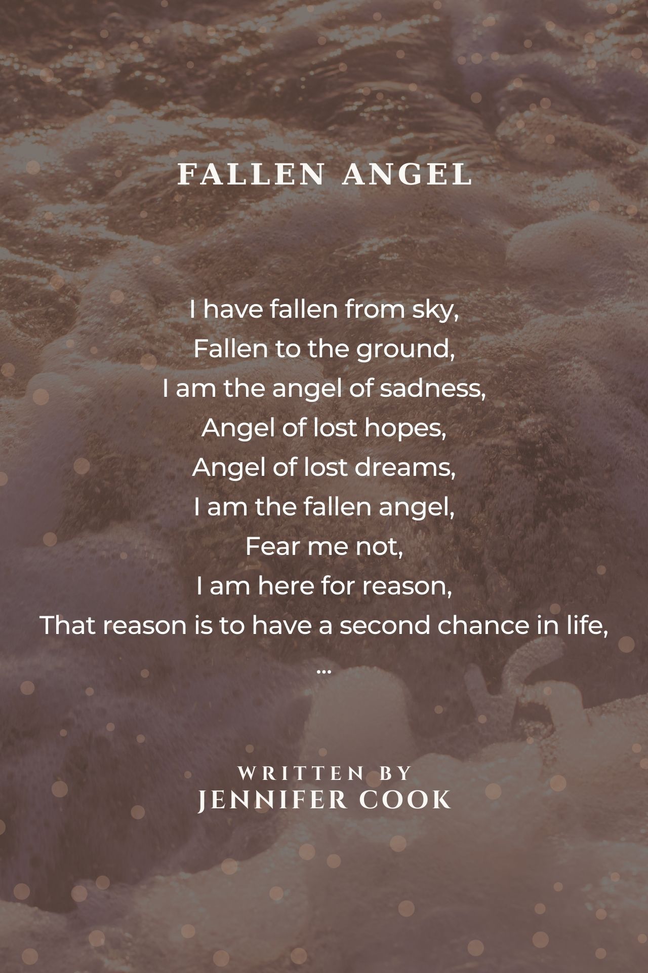 They took my wings, They took me apart made me human, I was the fallen angel, But that fallen angel had one chance in life that she was given, This angel won’t make the same mistakes she made before, What a nice poem! Thanks for sharing it. 10.