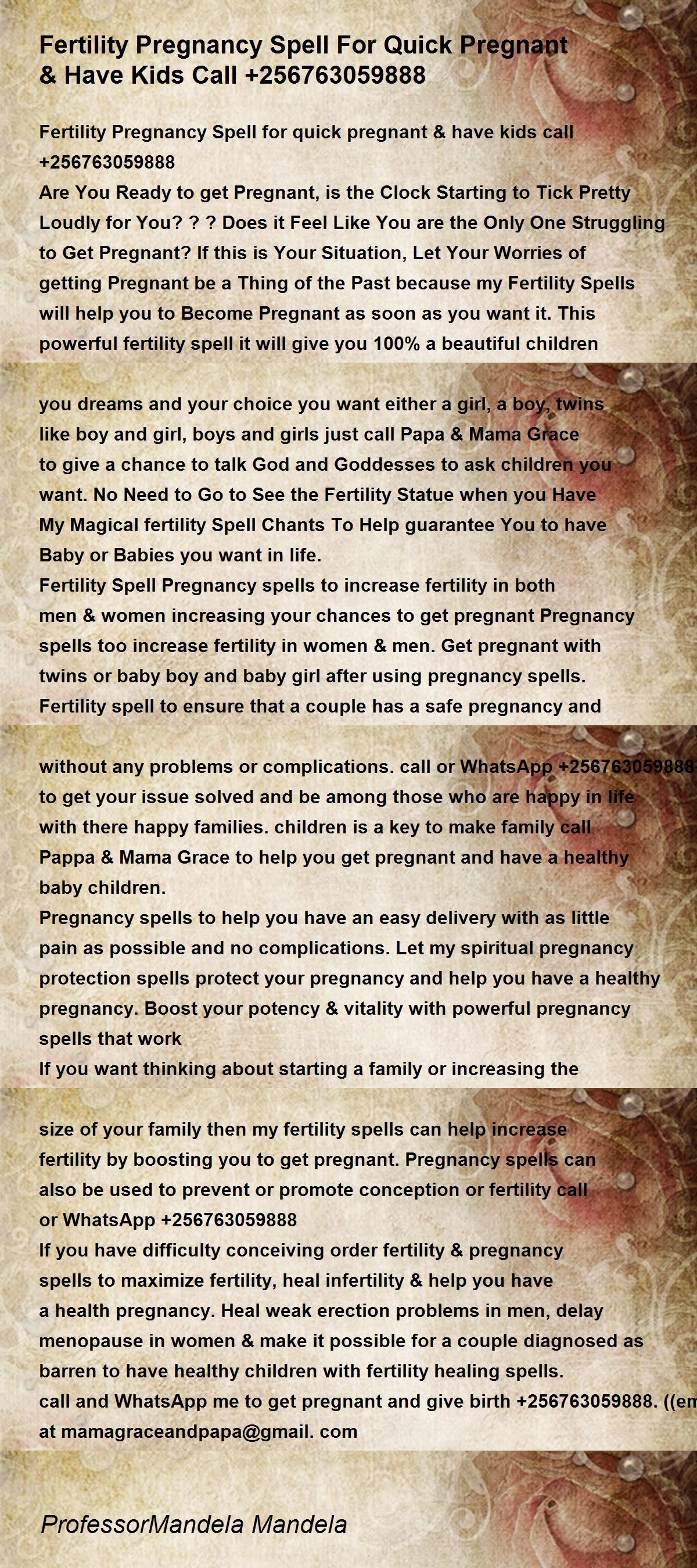 If you have difficulty conceiving order fertility & pregnancy spells to maximize fertility, heal infertility & help you have a health pregnancy. Heal weak erection problems in men, delay menopause in women & make it possible for a couple diagnosed as barren to have healthy children with fertility healing spells. call and WhatsApp me to get pregnant and give birth +256763059888.((email)) at [email protected]
