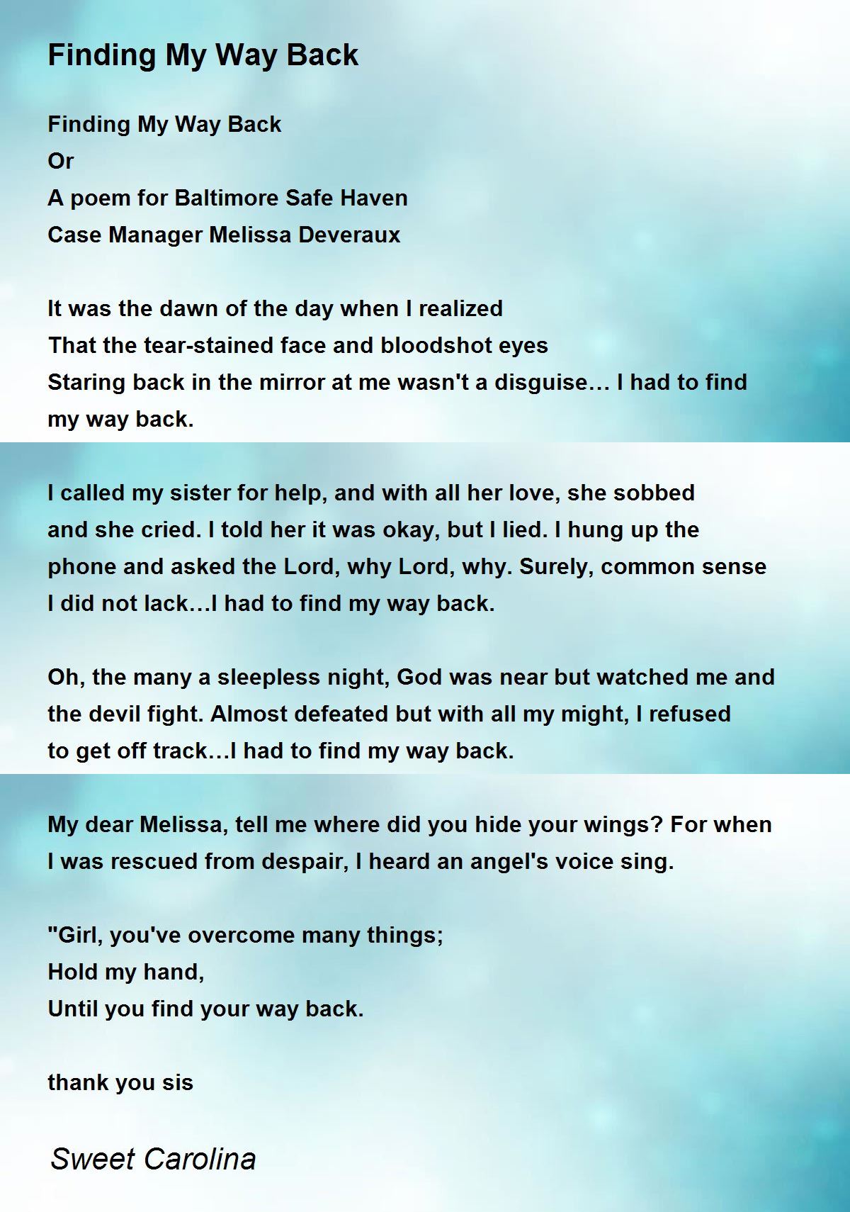 I called my sister for help, and with all her love, she sobbed and she cried. I told her it was okay, but I lied. I hung up the phone and asked the Lord, why Lord, why. Surely, common sense I did not lack…I had to find my way back.