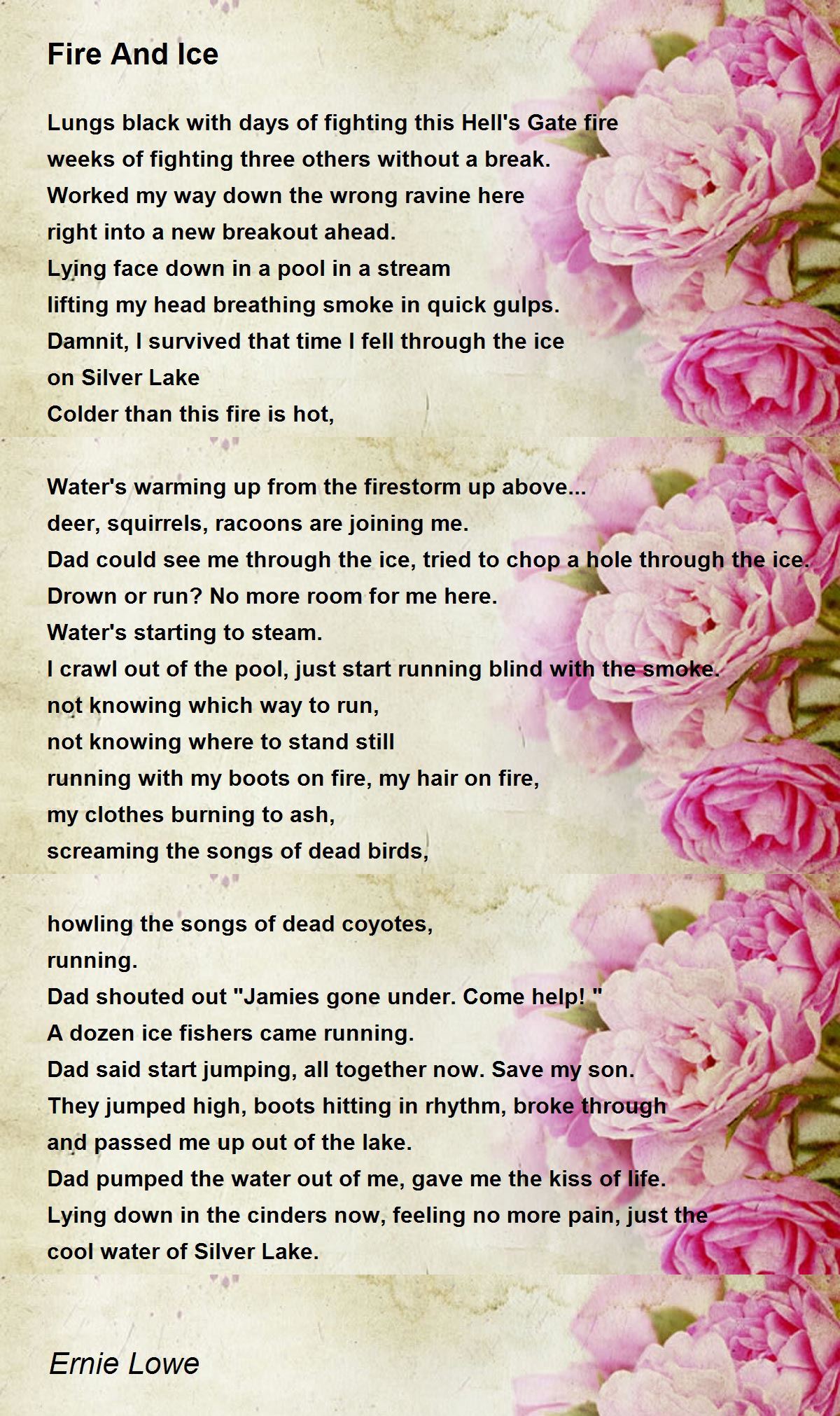 Lying down in the cinders now, feeling no more pain, just the cool water of Silver Lake.