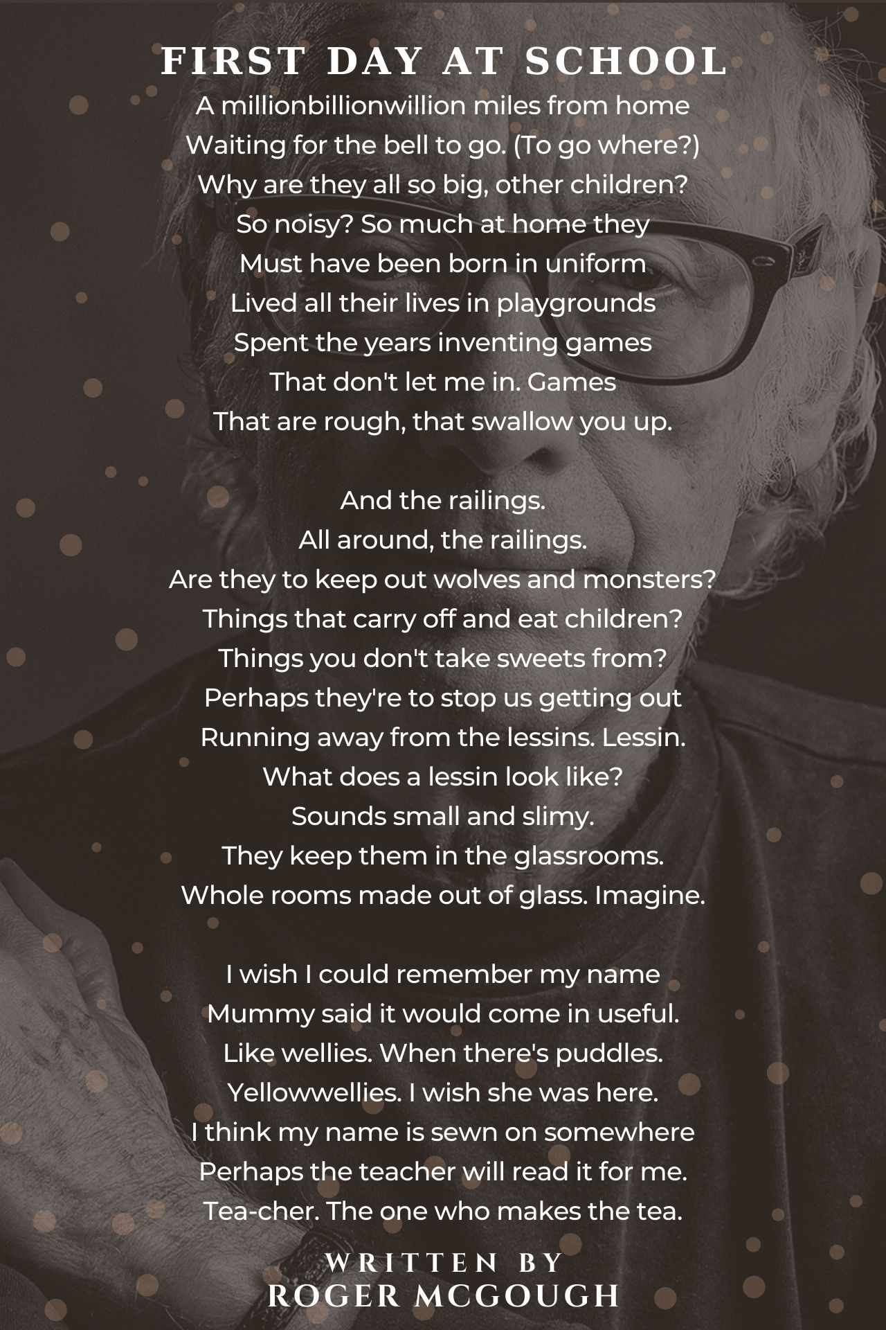 2) hilarious poem, but never to insult these kids, just to show HOW it goes that First Day At School. I regard this poem full of intelligence to think and create a poem about that First School Day. A marvelous poem 5 Stars Full Most deserving as The Modern Poem Of The Day