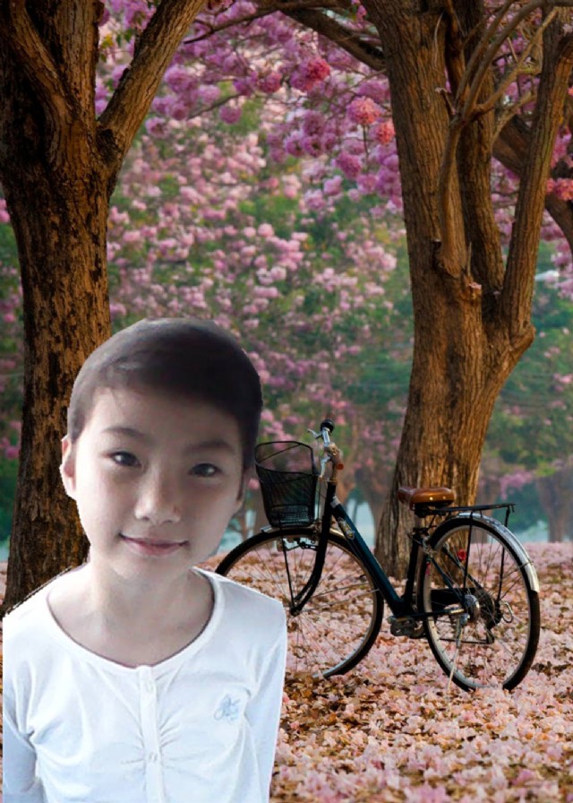 First rode a bicycle, Against the trunk, Into a peach circle.