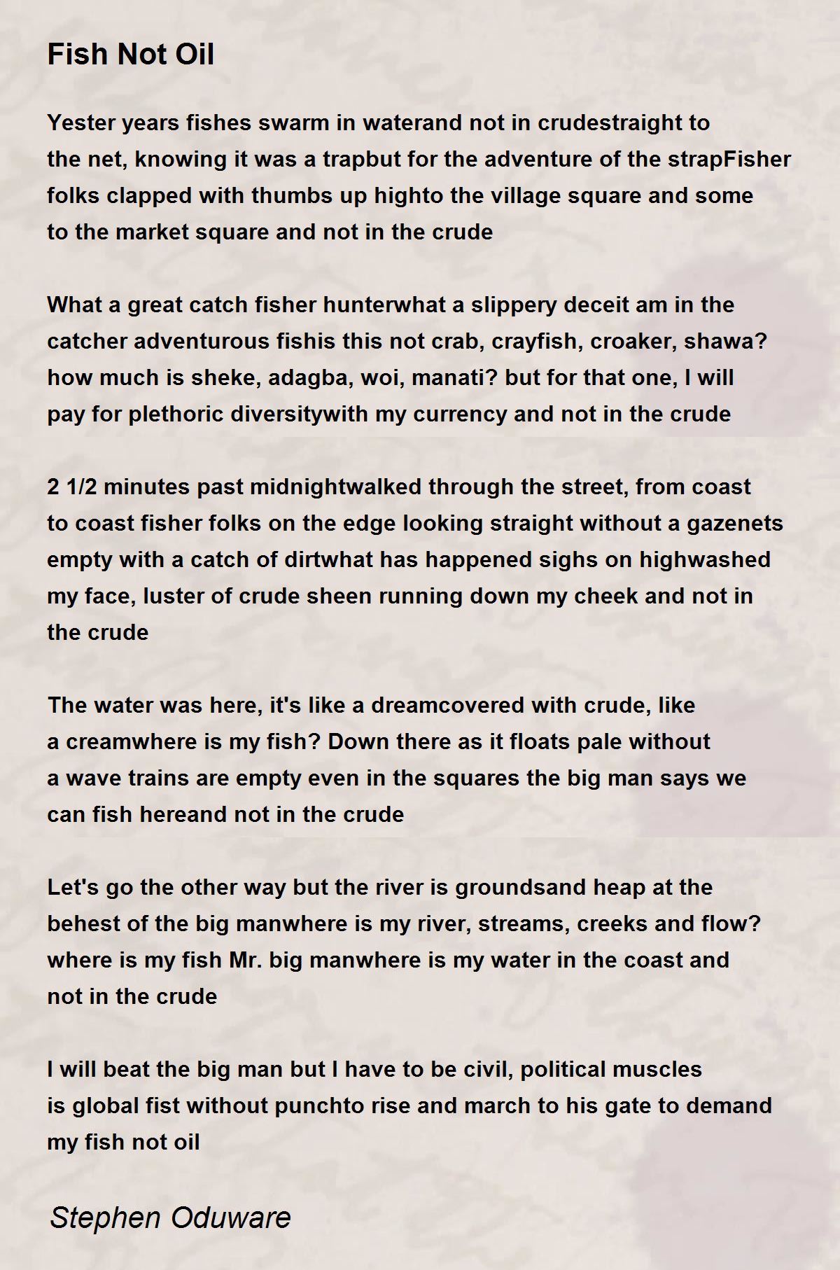 The water was here, it's like a dreamcovered with crude, like a creamwhere is my fish?Down there as it floats pale without a wave trains are empty even in the squares the big man says we can fish hereand not in the crude