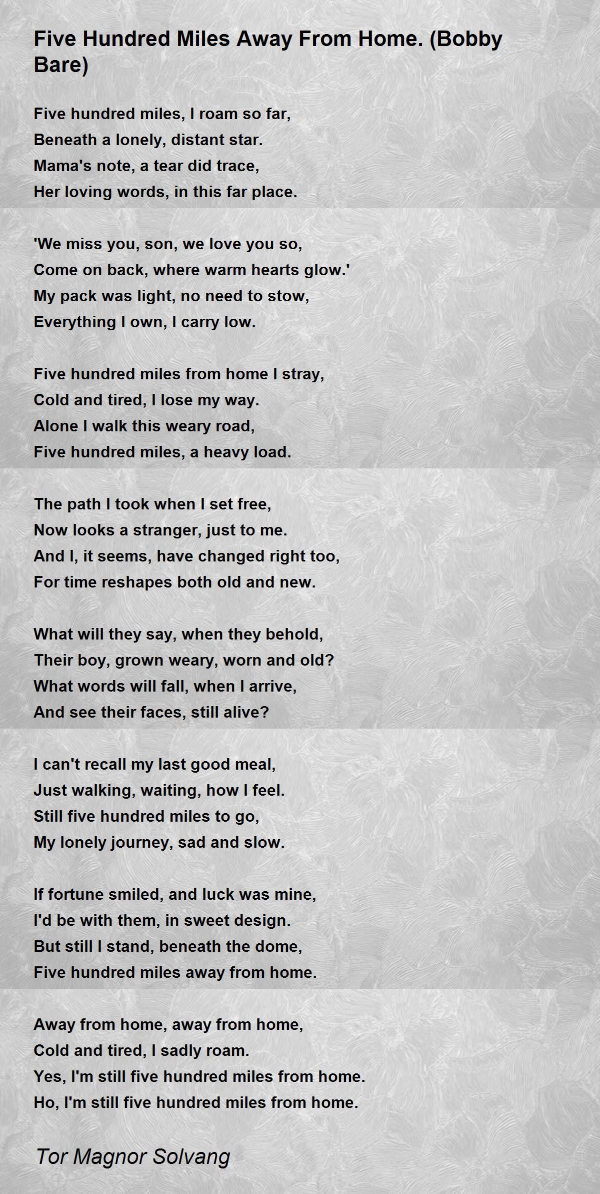 Five hundred miles, I roam so far,