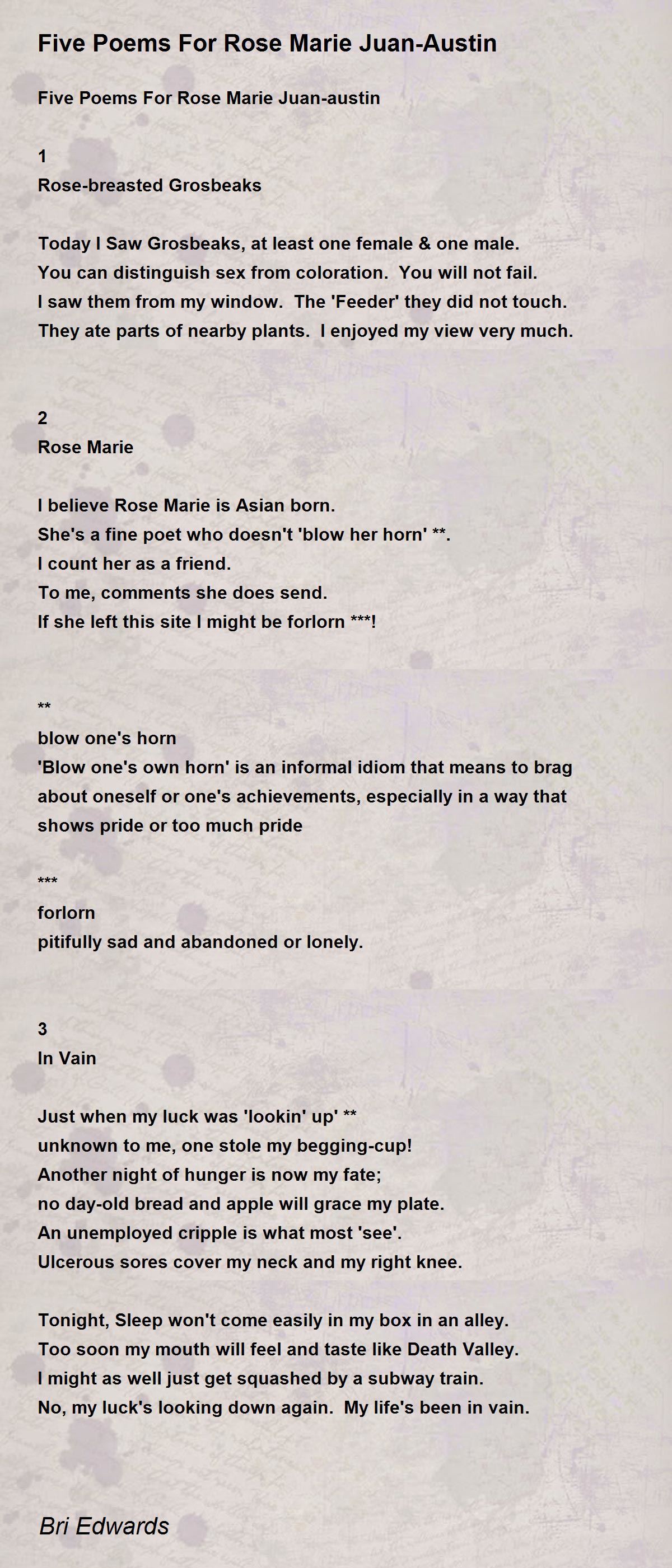 Truly great to see poems dedicated to the brilliant poetess Rose Marie Juan Austin. She is wonderful Poetess and a human being as well. Kudos! Top score