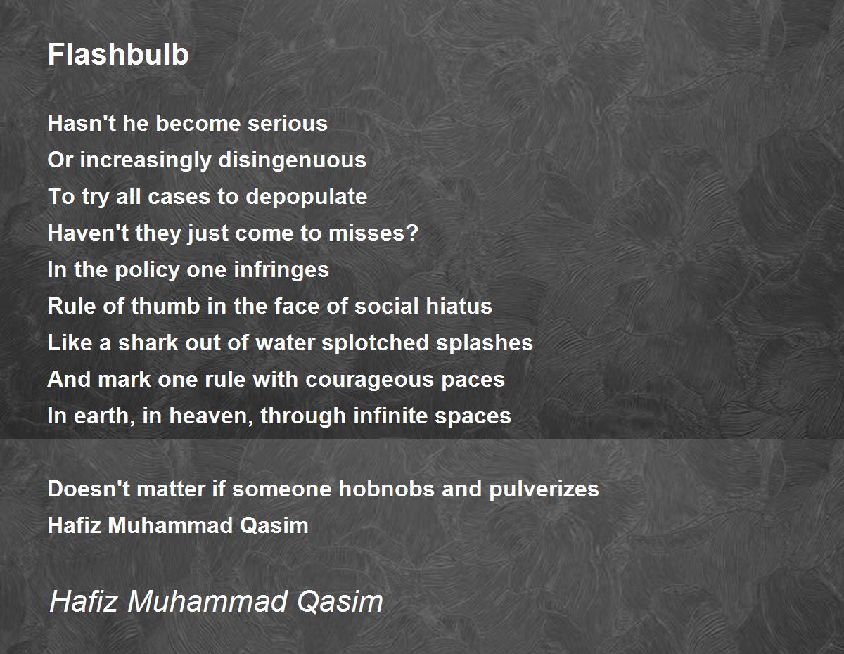 Certainly! Let's analyze the poem 'Flashbulb' by Hafiz Muhammad Qasim step by step. **Structure: ** The poem is structured in four quatrains (four-line stanzas) . Each quatrain follows a consistent pattern, with a rhyme scheme of AABD (the last two lines of each quatrain rhyme) . This rhyme scheme gives the poem a rhythmic flow and a sense of continuity. **Key Themes: ** 1. **Disillusionment/Disengagement: ** The poem seems to address a feeling of disillusionment or disengagement from a person or a system that the speaker feels has become serious or disingenuous.2. **Policymaking and Rules: ** There is a theme regarding the infringement of rules and policies, which may suggest a criticism of the political or social structures at play.3. **Isolation and Powerlessness: ** The image of a shark out of water evokes a sense of isolation and powerlessness, perhaps implying that those who are in control or have power are struggling in a world where they no longer fit. **Symbolism: ** 1. **Flashbulb: ** The title suggests a moment captured in time, but also a fleeting moment that fades quickly, which could symbolize the temporary nature of any moment of clarity or insight.2. **Shark Out of Water: ** The image of a shark out of water symbolizes struggle and discomfort in an environment not suited for survival, which could be a metaphor for the speaker's perception of the struggle of those in power or those who are enforcing rules that are out of sync with the current social landscape. **Literary Devices: ** 1. **Personification: ** The shark is given the human trait of 'splotched splashes, ' which personifies the shark and adds to the metaphor of powerlessness and chaos.2. **Metaphor: ** The poem uses metaphor extensively, with the shark out of water and the policymakers infringing on social order being prominent examples.3. **Imperative Verbs: ** The use of 'try, ' 'depopulate, ' 'infringes, ' and 'mark' creates a sense of urgency and commands attention, as if the speaker is addressing a dire situation.4. **Alliteration: ** The repetition of 'splotched splashes' creates alliteration, which emphasizes the chaos and disarray. **Tone: ** The tone of the poem is primarily critical and somewhat ominous. There's a sense of urgency and disillusionment in the speaker's voice. The poem feels like a cautionary tale or a warning against a system that is out of touch with reality. The tone is also reflective, as the speaker seems to be pondering the nature of power, control, and the human condition within the current societal context. In summary, 'Flashbulb' by Hafiz Muhammad Qasim is a poem that explores themes of disillusionment, the failings of political and social systems, and the powerlessness felt by those within them. Through vivid symbolism, literary devices, and a reflective tone, the poem invites readers to consider the complexities of power, rule-making, and the human condition.